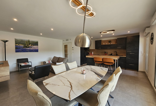 Ce bel appartement neuf de 77m² se compose d'un grand couloir d'entrée qui donne sur un beau séjour avec canapé convertible, fauteuils, TV écran plat, une partie salle à manger avec table et chaises, et une belle cuisine américaine toute équipée (Frigo avec congélateur, plaque vitr...