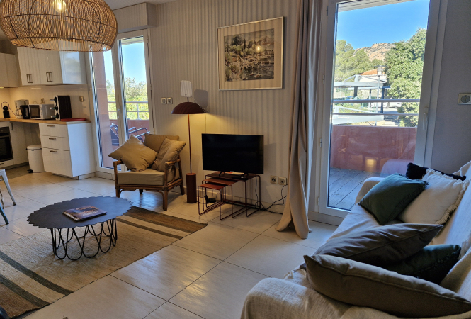 Beau deux pièces dans une résidence d'excellent standing, face à la mer, avec piscine, accès privilégié à une crique en face de la résidence, plage de sable à 300 mètres, et commerces et restaurants à 600m.l'appartement est en duplex avec uu rez-de-chaussée un hall ...