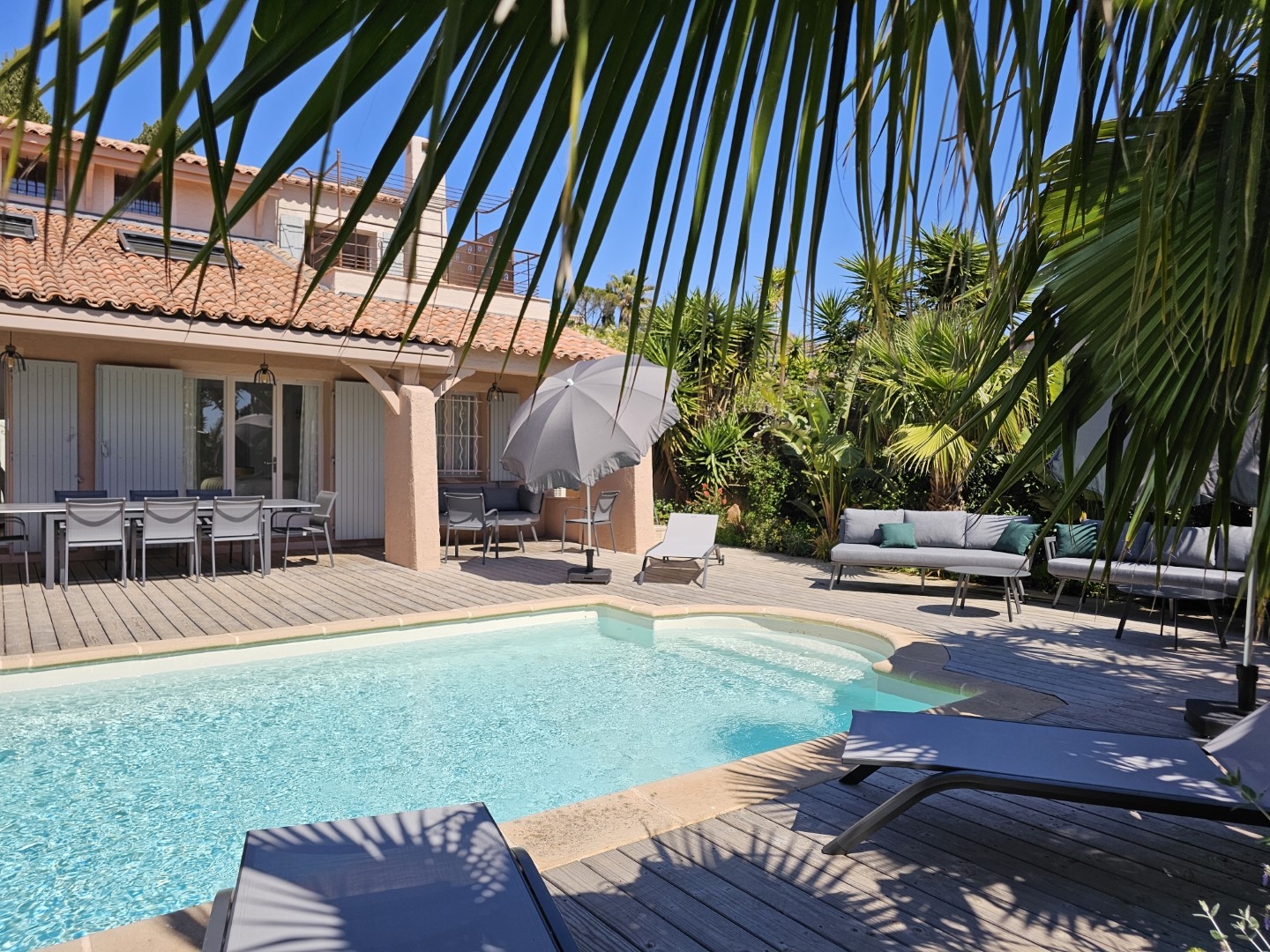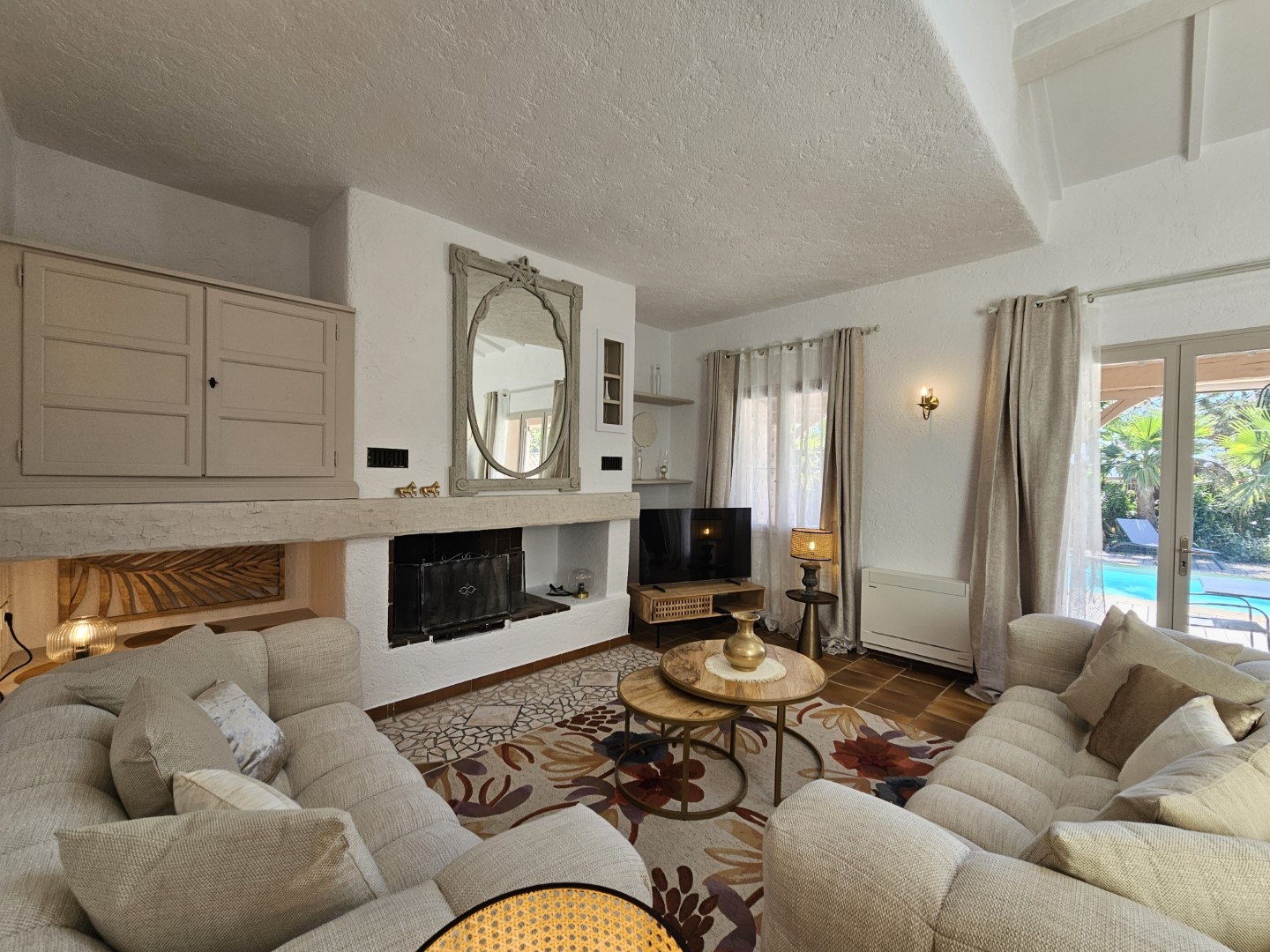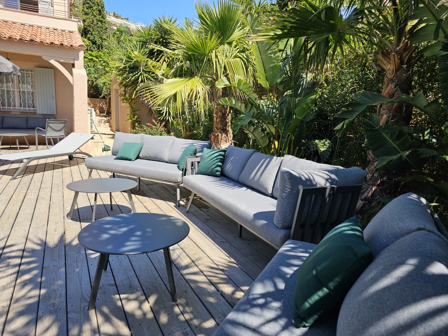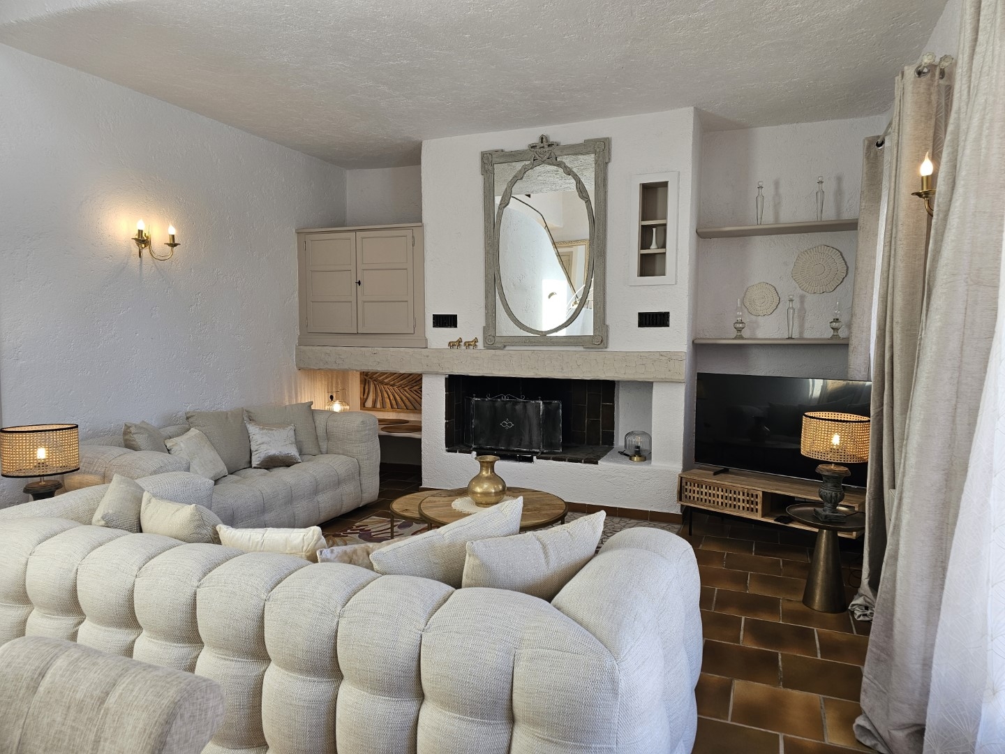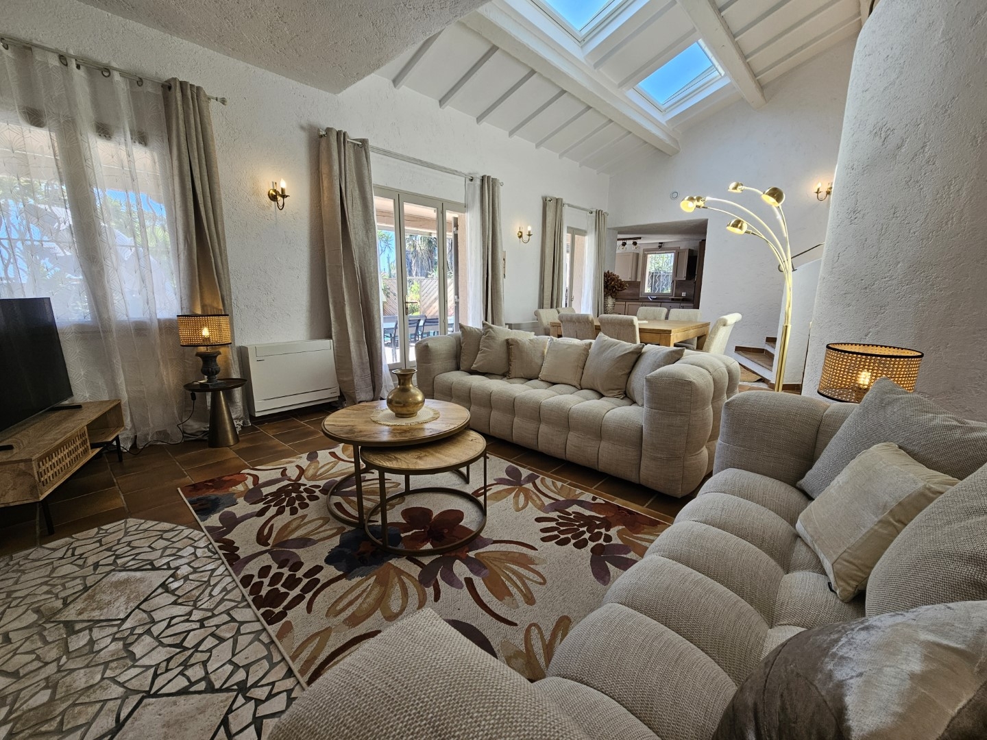 Cette charmante villa entièrement remise à neuf, vous accueille en famille ou entre amis pour des vacances reposantes, dans un cadre verdoyant, proche de la mer. Située dans le domaine privé et sécurisé d’Anthéor, l’environnement est calme et privilégié. D’une surface approximative de 200m², cette belle maison vous propose : un beau salon à l’ambiance cosy, avec une partie salle à manger (grande table pour 10 personnes), un espace canapé et détente avec le coin TV ; une cuisine ouverte entièrement équipée d’éléments de qualité avec frigidaire, four, micro-ondes, cafetière Nespresso, grille-pain, bouilloire, etc. (plus une arrière-cuisine). Au même niveau, une salle d’eau avec WC, une première chambre avec un lit double 160x200, une deuxième chambre avec lit double 160x200, et une deuxième salle d’eau avec wc.