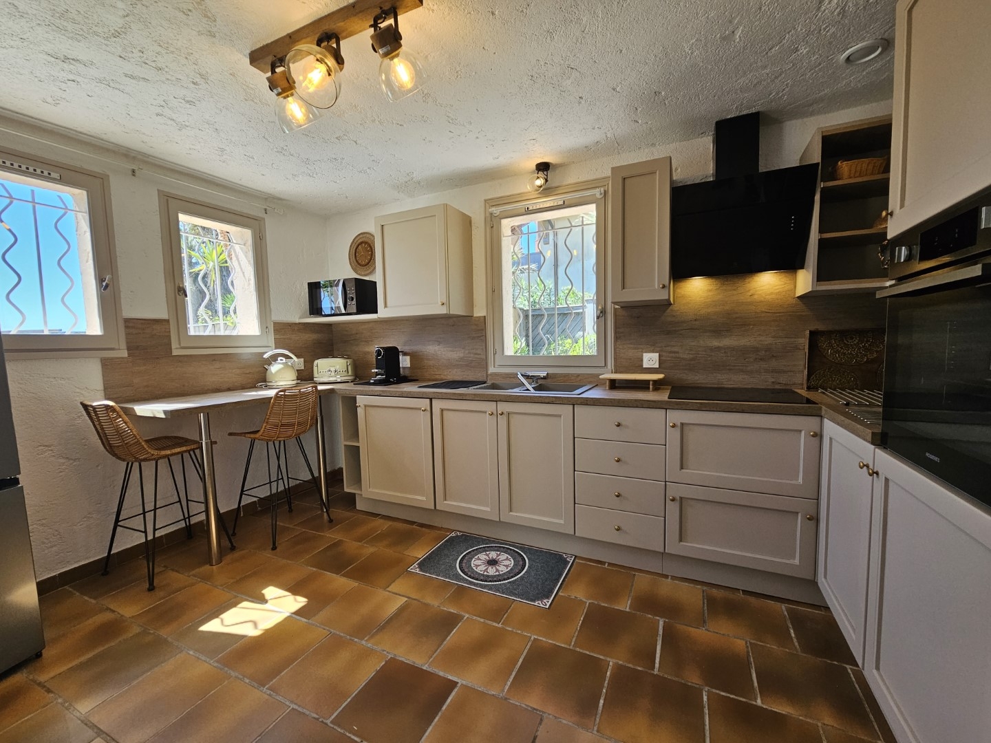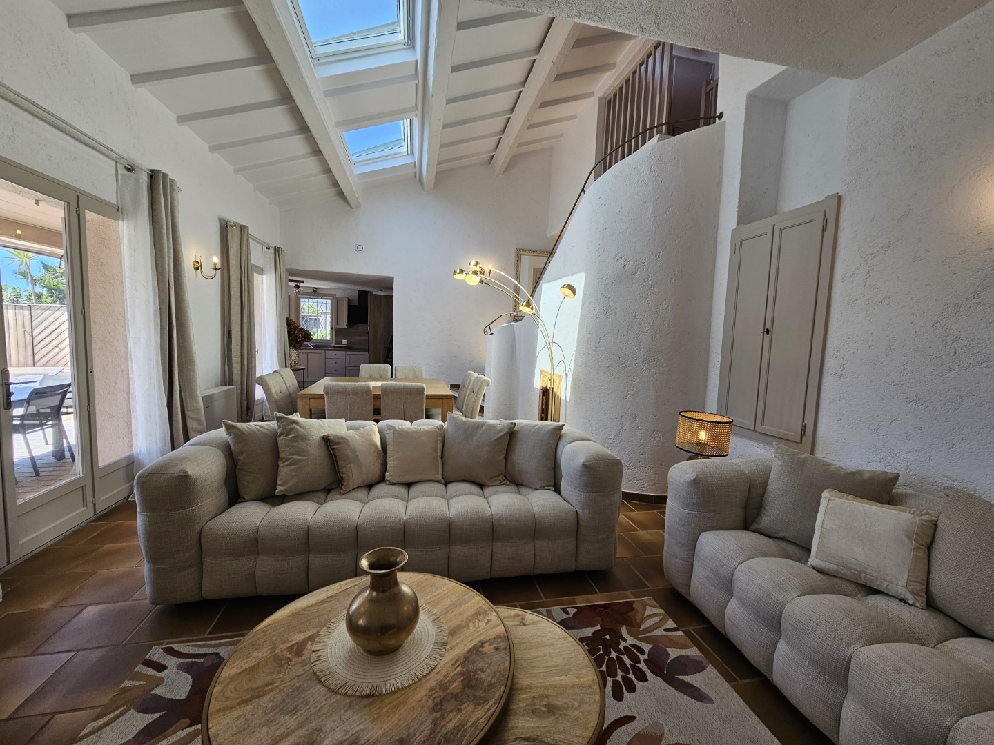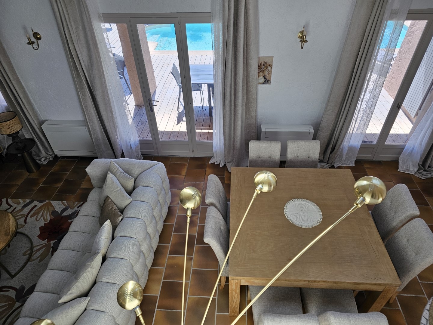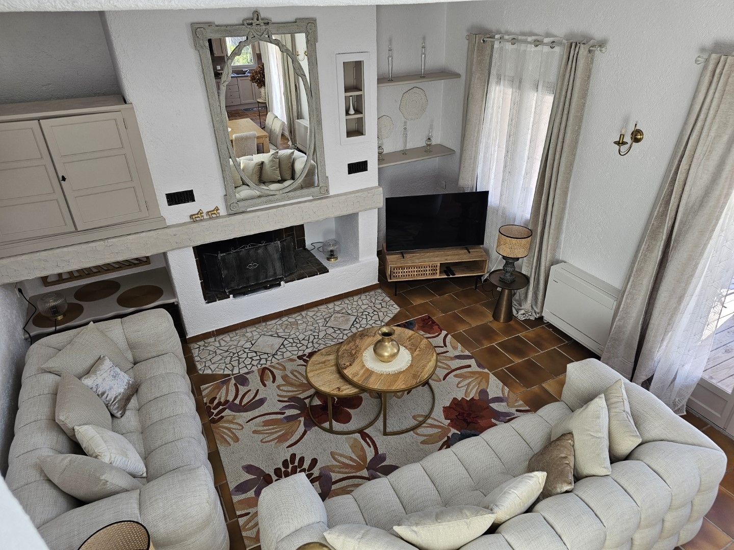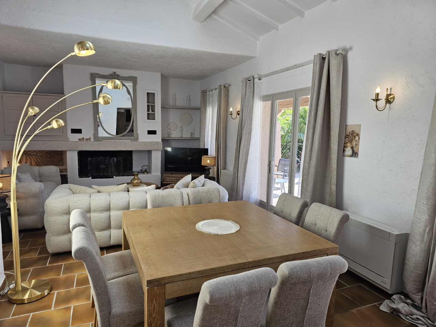 Cette charmante villa entièrement remise à neuf, vous accueille en famille ou entre amis pour des vacances reposantes, dans un cadre verdoyant, proche de la mer. Située dans le domaine privé et sécurisé d’Anthéor, l’environnement est calme et privilégié. D’une surface approximative de 200m², cette belle maison vous propose : un beau salon à l’ambiance cosy, avec une partie salle à manger (grande table pour 10 personnes), un espace canapé et détente avec le coin TV ; une cuisine ouverte entièrement équipée d’éléments de qualité avec frigidaire, four, micro-ondes, cafetière Nespresso, grille-pain, bouilloire, etc. (plus une arrière-cuisine). Au même niveau, une salle d’eau avec WC, une première chambre avec un lit double 160x200, une deuxième chambre avec lit double 160x200, et une deuxième salle d’eau avec wc.
