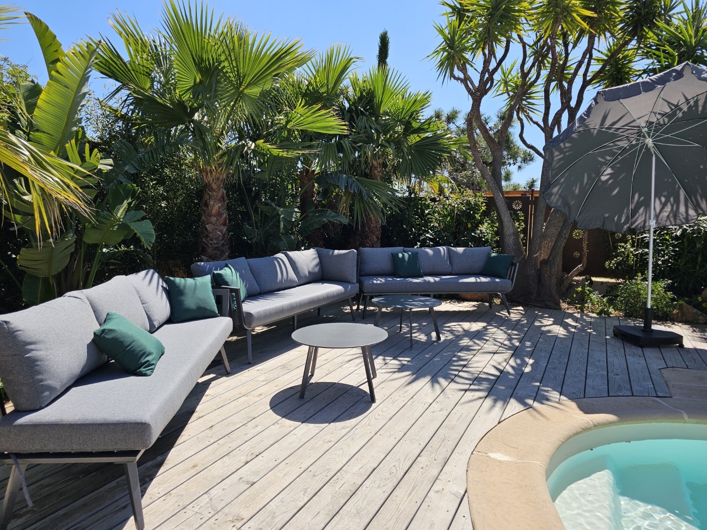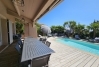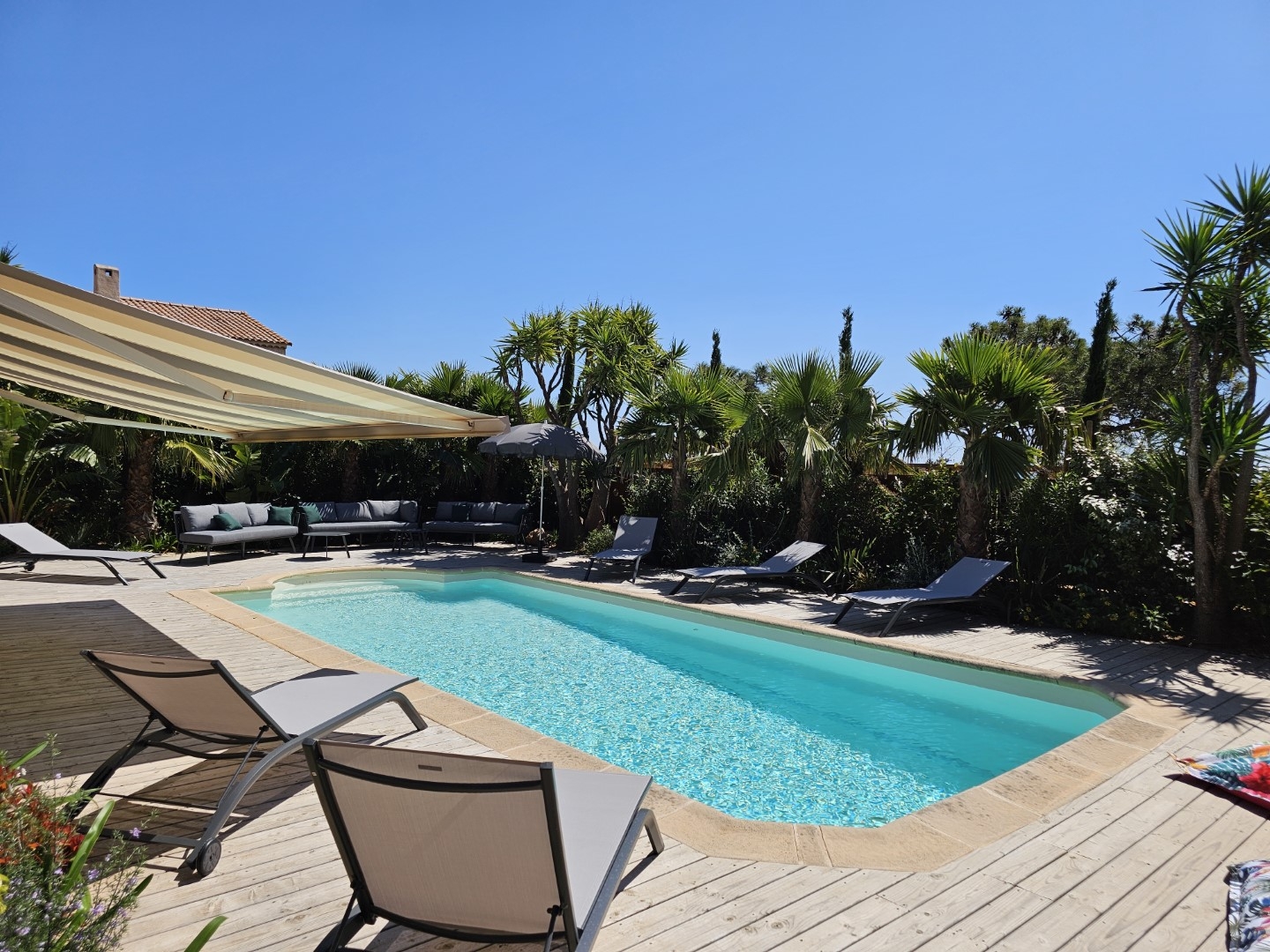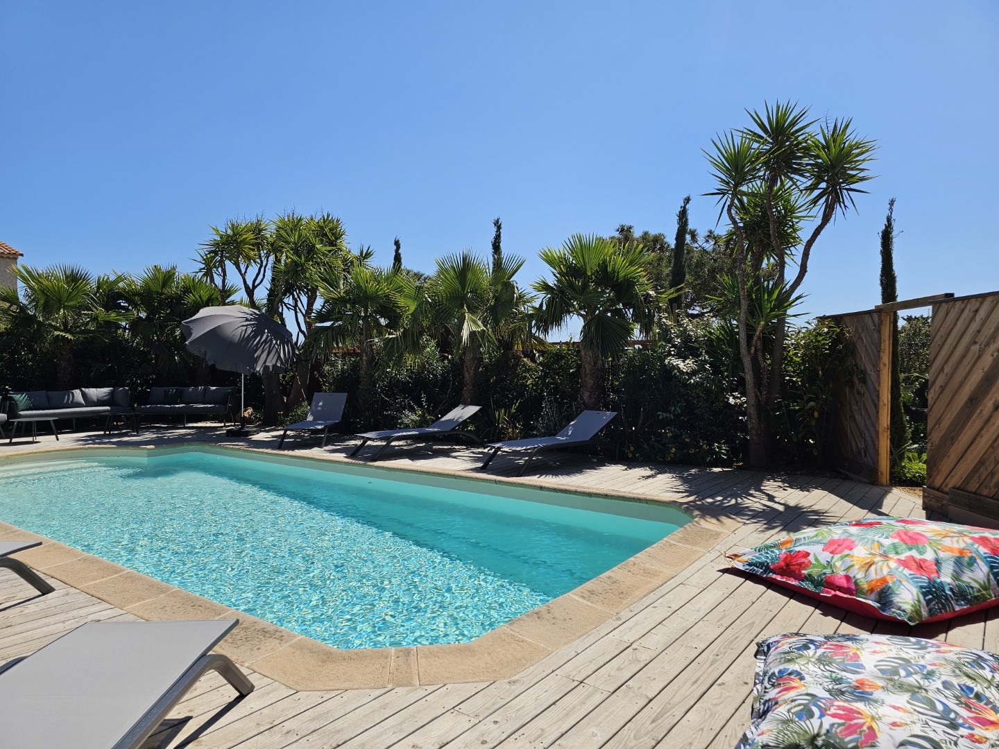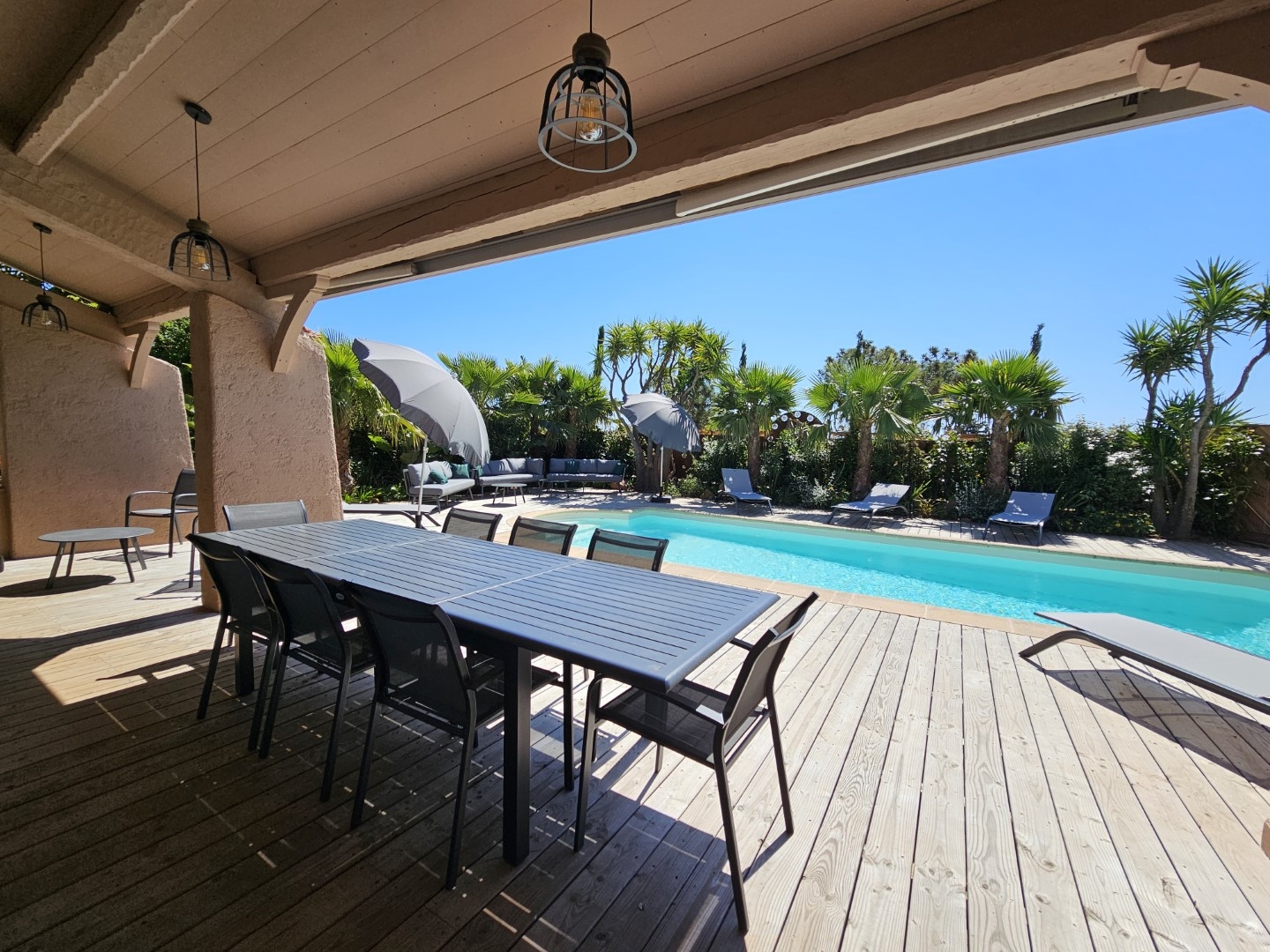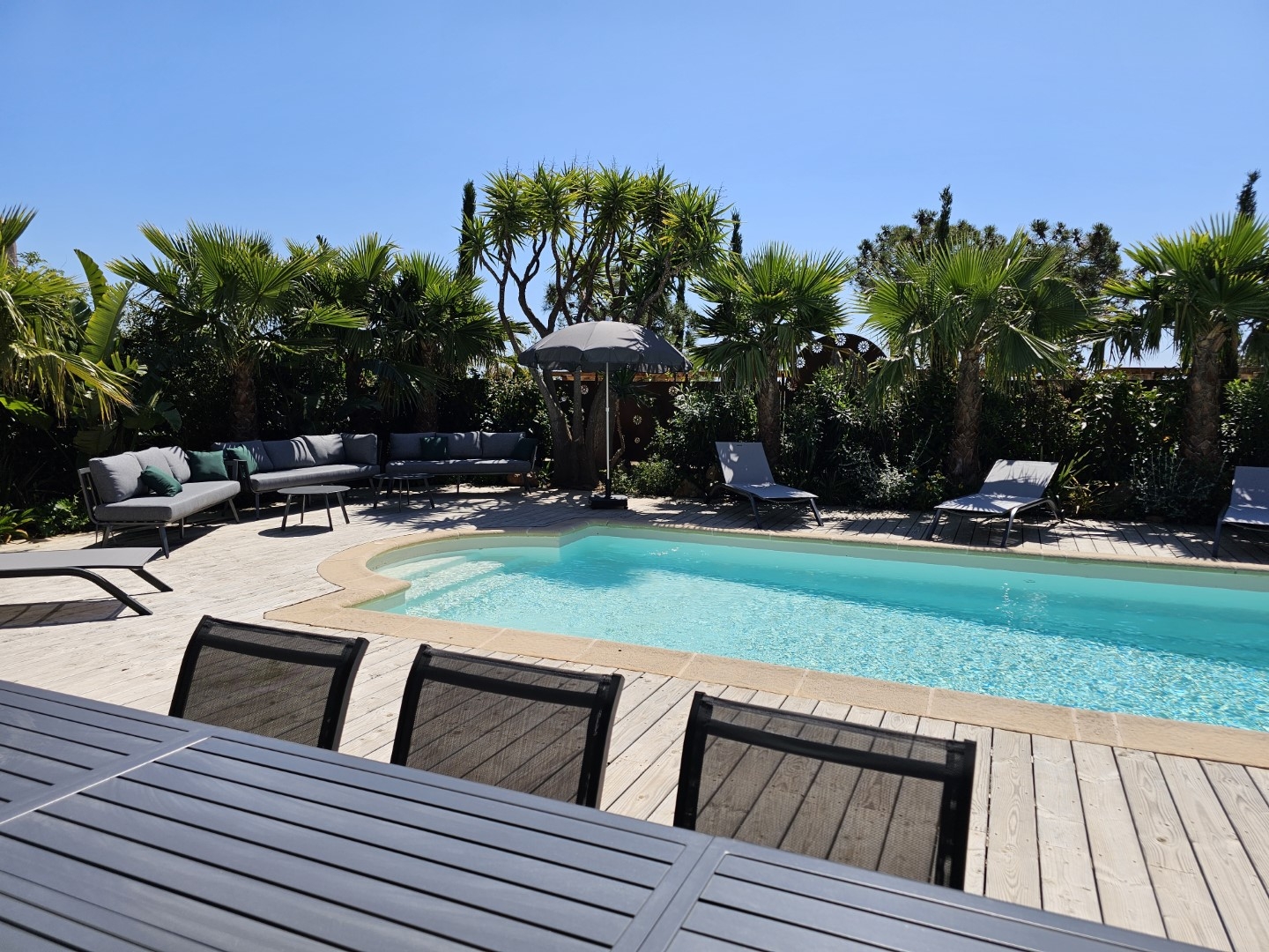 A l’extérieur, le salon et la cuisine donnent sur un très bel espace de terrasse dont une partie est couverte par la toiture, et prolongée par un très grand store pare soleil. A l’abri du soleil, vous disposerez d’une grande table et de chaises, avec plancha au gaz pour tous vos repas en extérieur. Entouré d’un magnifique jardin paysagé, une vaste terrasse en bois encadre la belle piscine (dimensions approximatives 11m x 5m) où vous pourrez profiter de bons moments d’activités rafraichissantes, mais aussi de détente : canapés, bains de soleil, parasols, tout est là pour vous inviter au farniente.