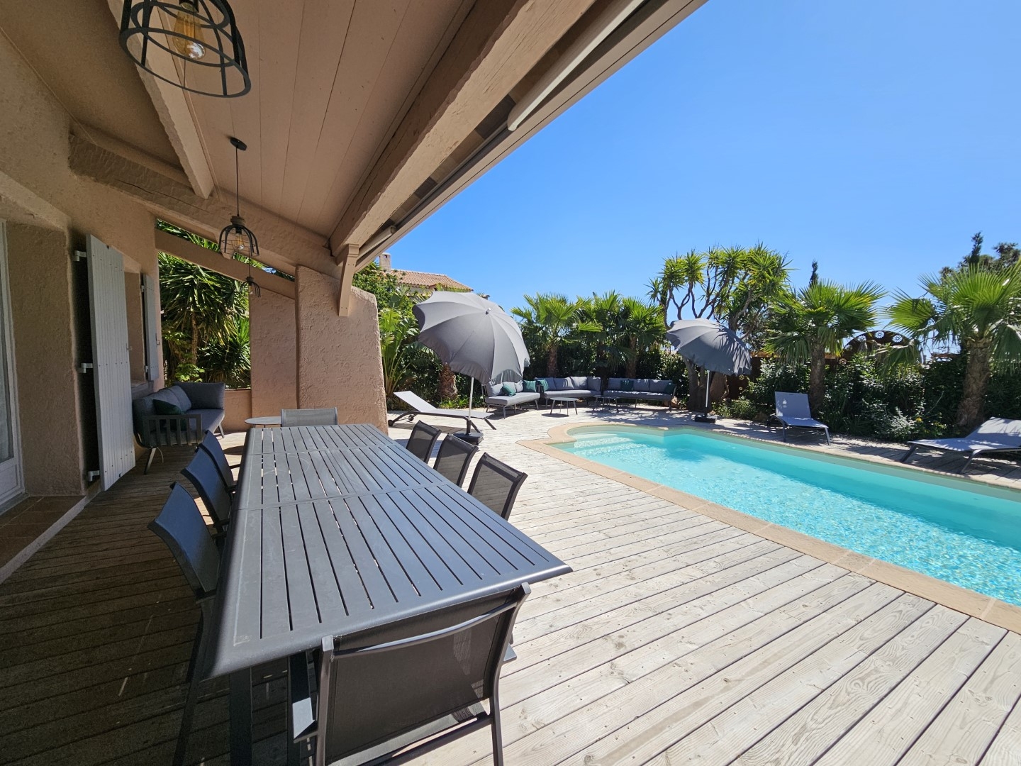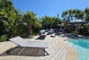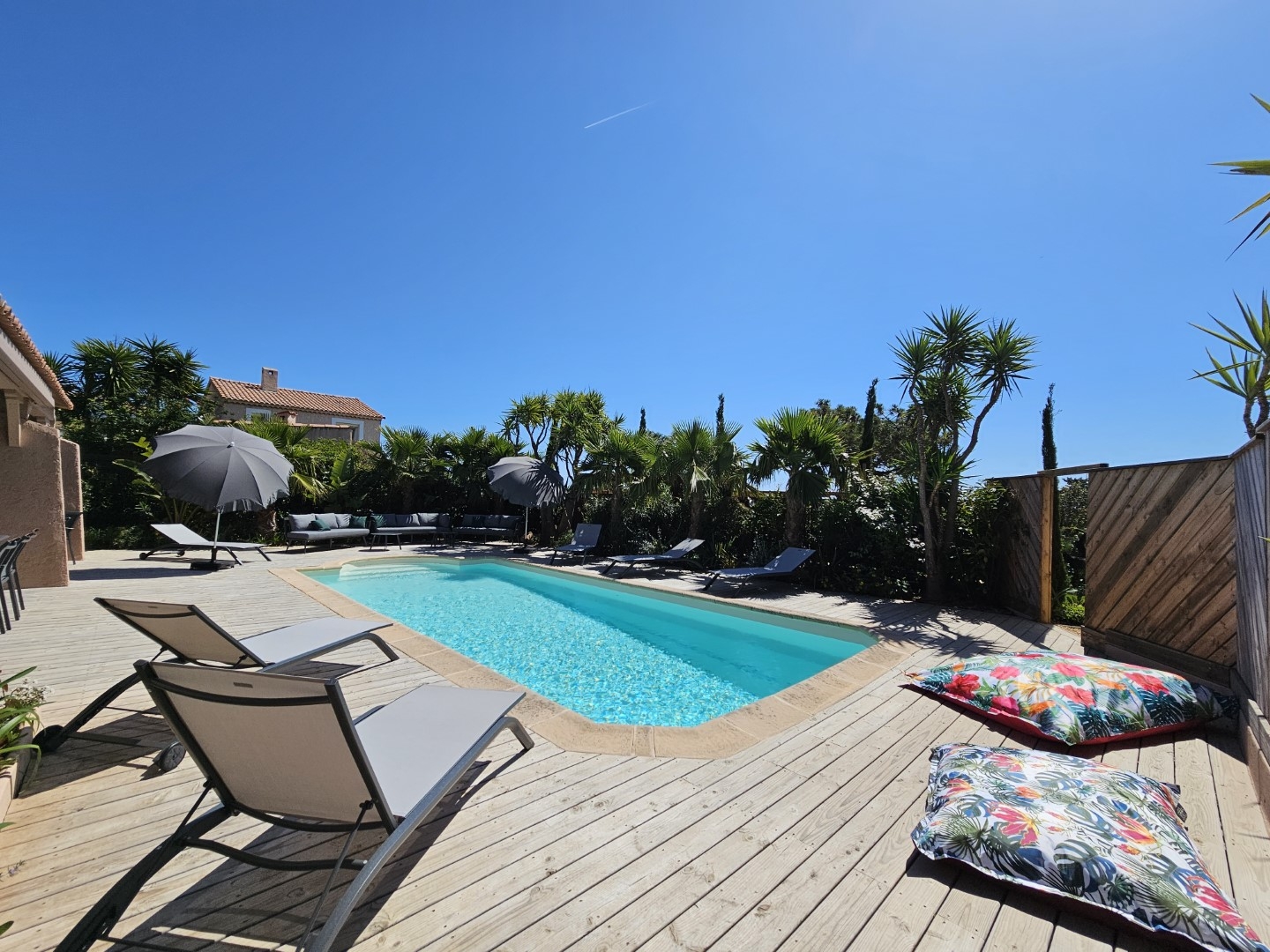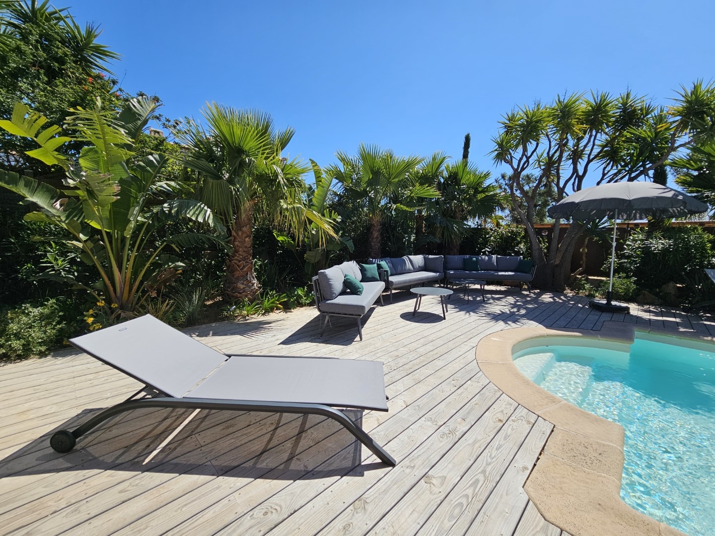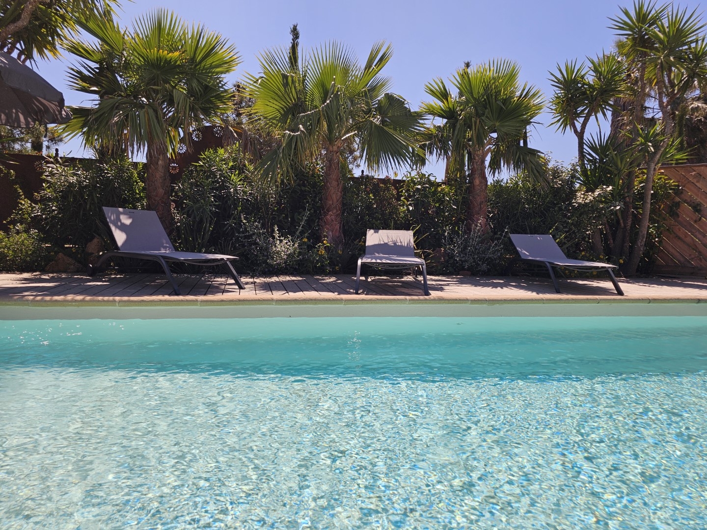 A l’extérieur, le salon et la cuisine donnent sur un très bel espace de terrasse dont une partie est couverte par la toiture, et prolongée par un très grand store pare soleil. A l’abri du soleil, vous disposerez d’une grande table et de chaises, avec plancha au gaz pour tous vos repas en extérieur. Entouré d’un magnifique jardin paysagé, une vaste terrasse en bois encadre la belle piscine (dimensions approximatives 11m x 5m) où vous pourrez profiter de bons moments d’activités rafraichissantes, mais aussi de détente : canapés, bains de soleil, parasols, tout est là pour vous inviter au farniente.