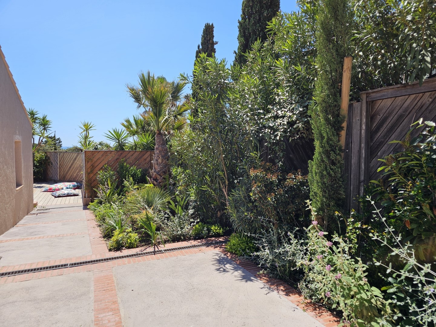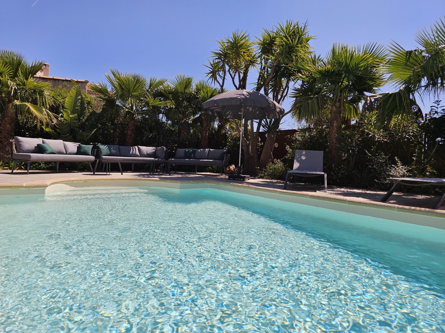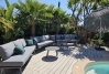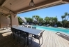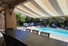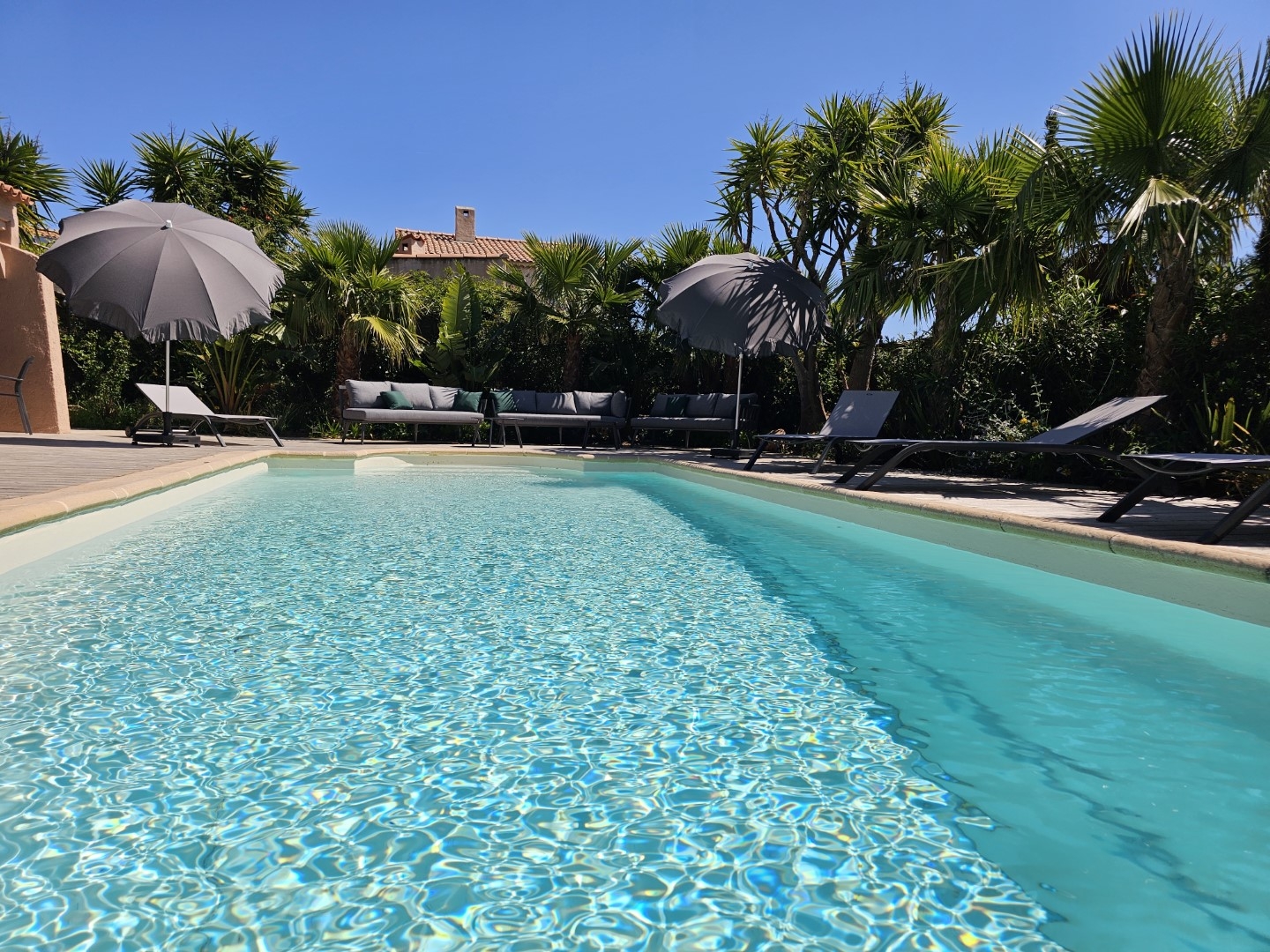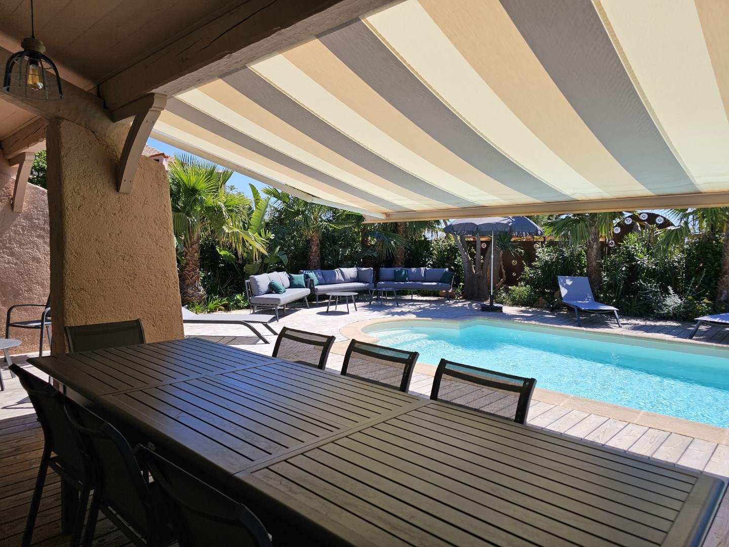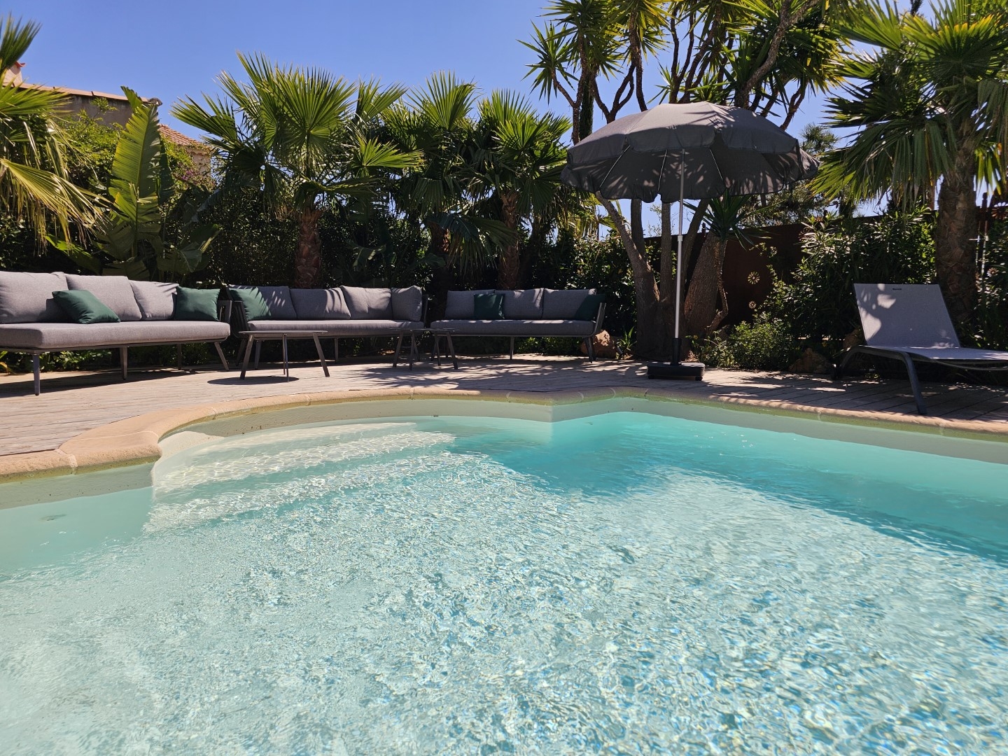 A l’extérieur, le salon et la cuisine donnent sur un très bel espace de terrasse dont une partie est couverte par la toiture, et prolongée par un très grand store pare soleil. A l’abri du soleil, vous disposerez d’une grande table et de chaises, avec plancha au gaz pour tous vos repas en extérieur. Entouré d’un magnifique jardin paysagé, une vaste terrasse en bois encadre la belle piscine (dimensions approximatives 11m x 5m) où vous pourrez profiter de bons moments d’activités rafraichissantes, mais aussi de détente : canapés, bains de soleil, parasols, tout est là pour vous inviter au farniente.