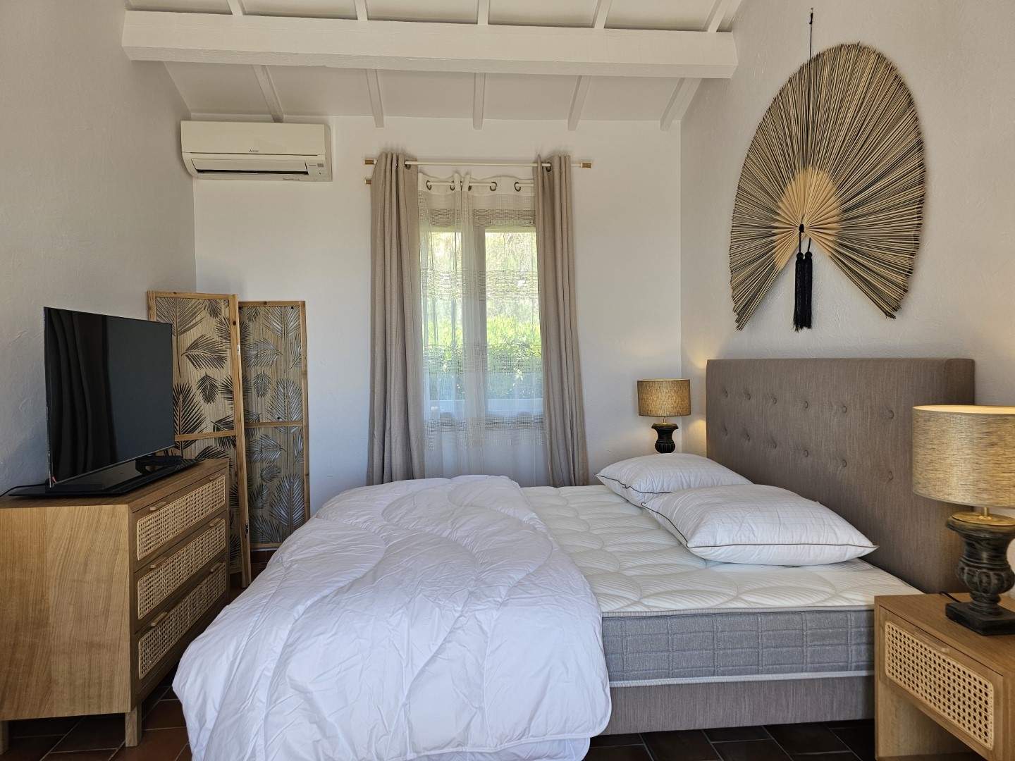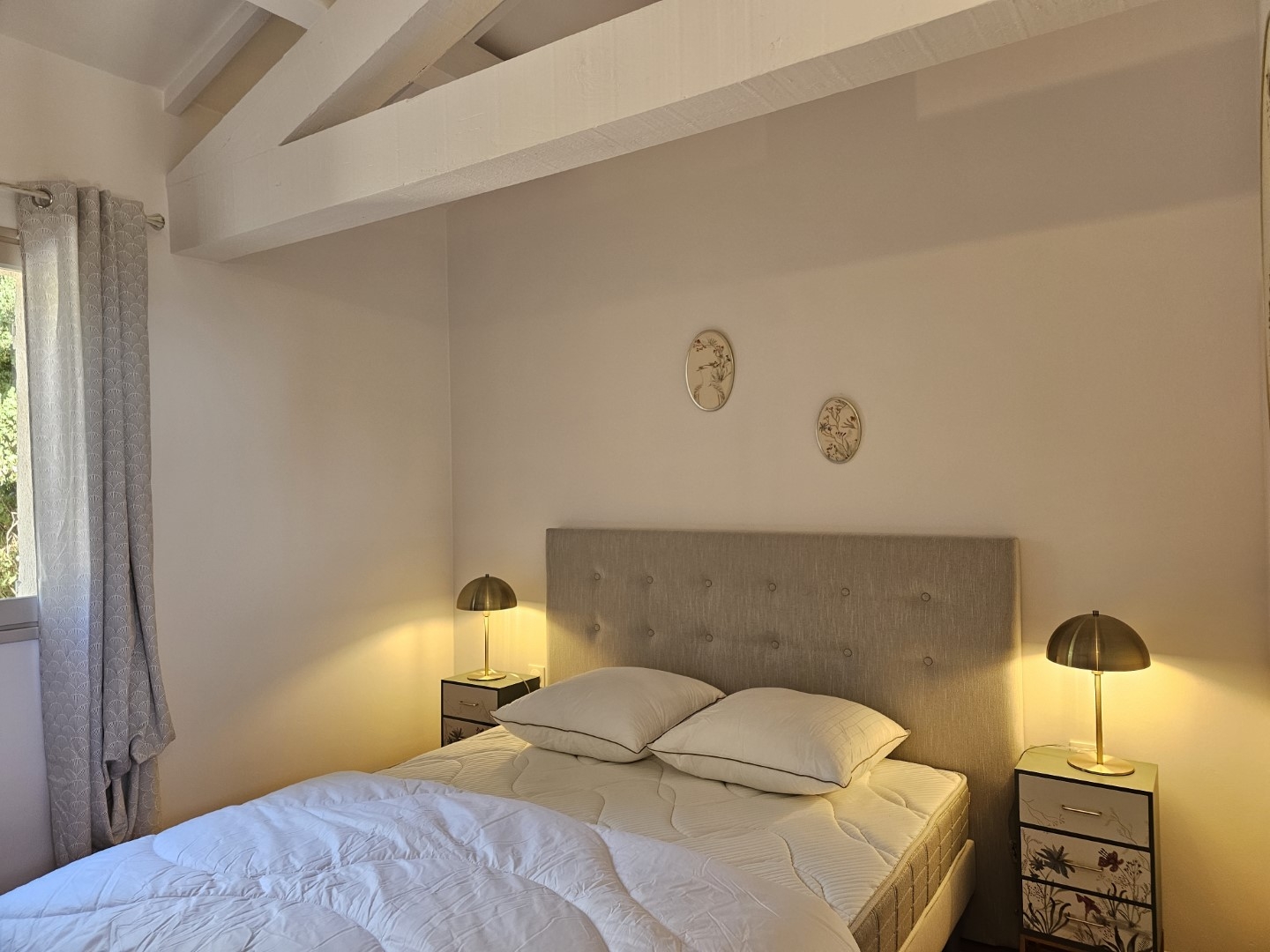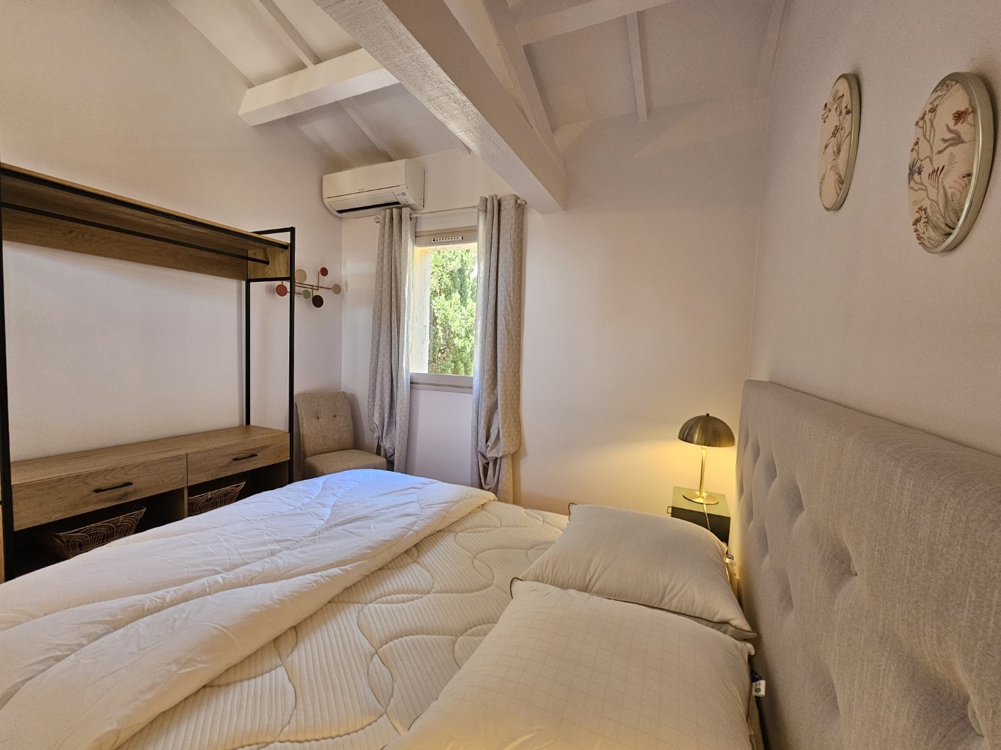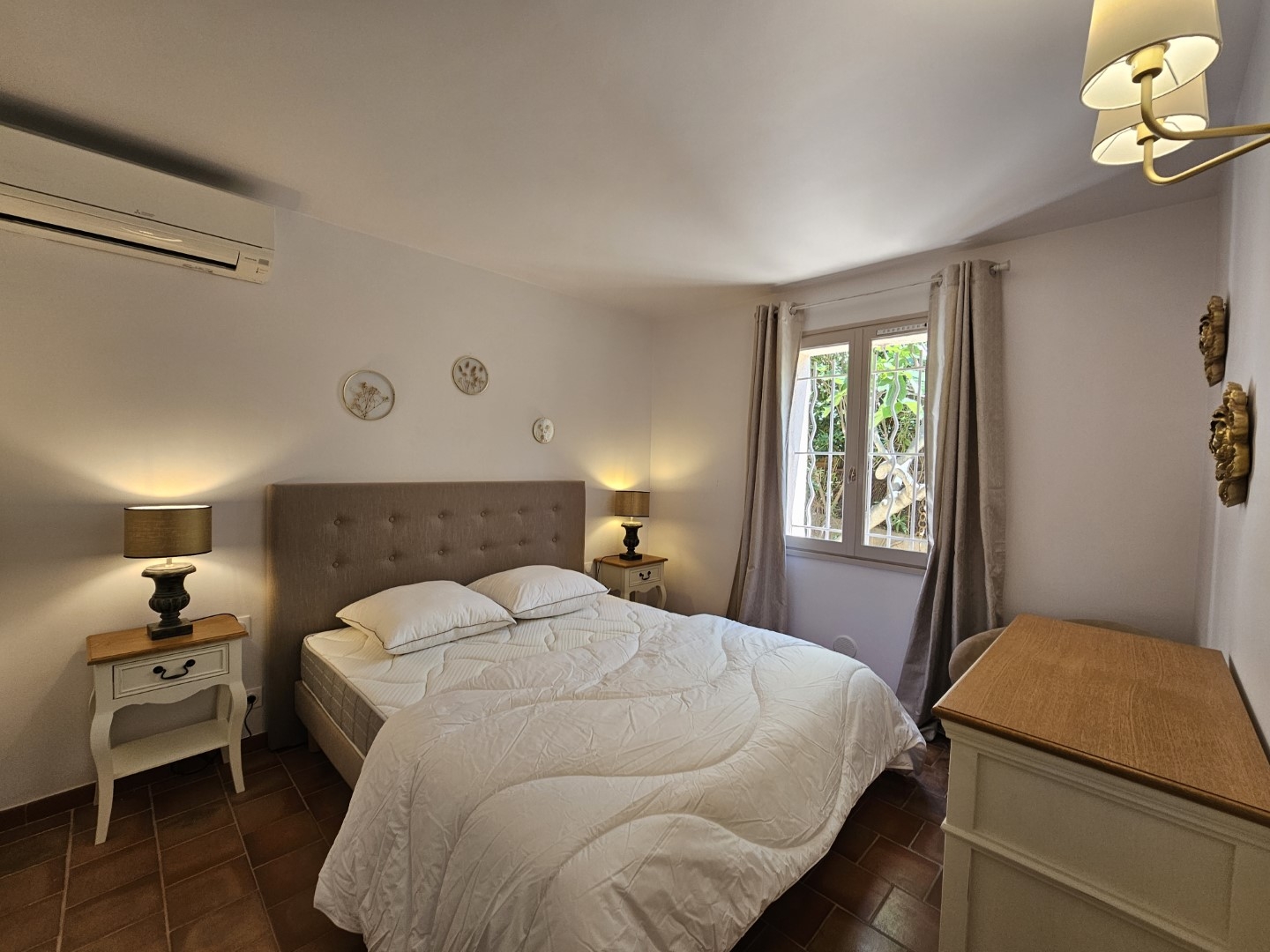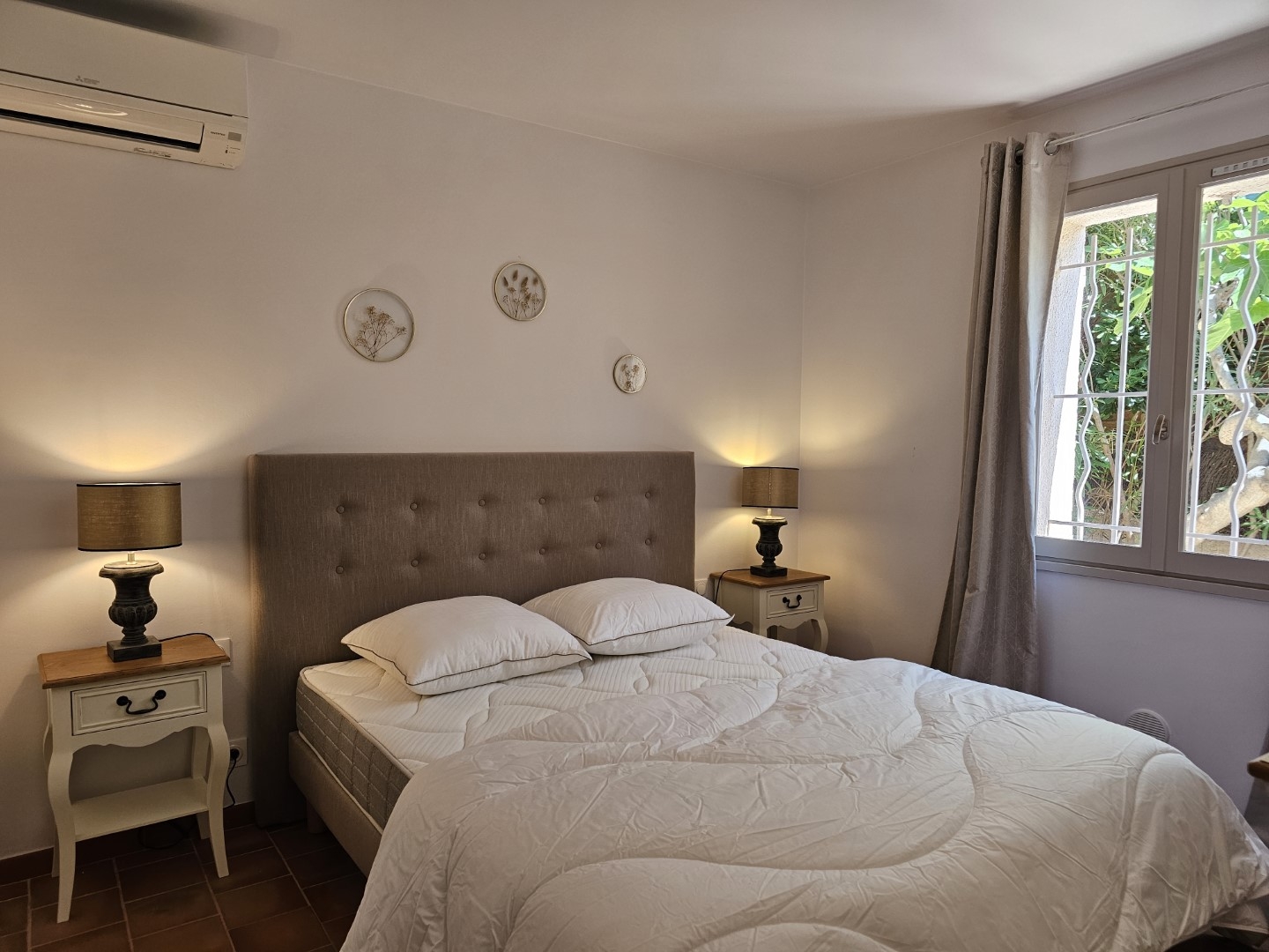 A l’étage, on retrouve une troisième chambre avec deux lits simples, une troisième salle d’eau avec wc, une quatrième chambre avec lit double 160x200, et la chambre de maître avec son grand lit double 180x200, TV, et sa belle terrasse avec une très jolie vue sur la mer. Pour plus de confort la maison est entièrement climatisée.