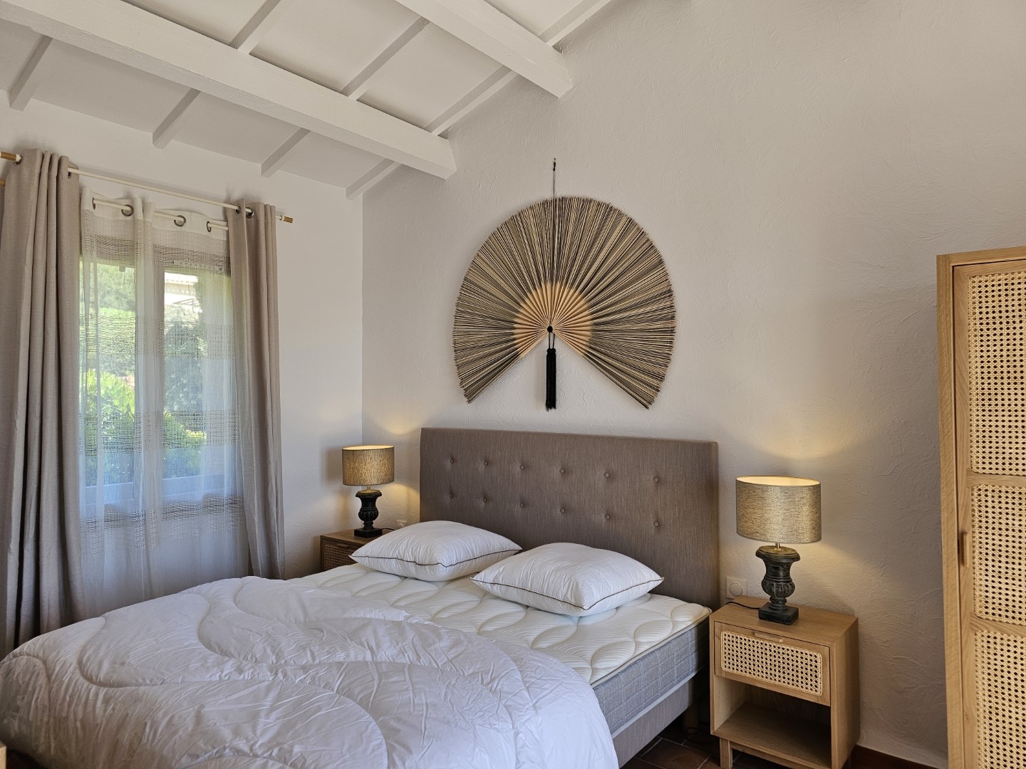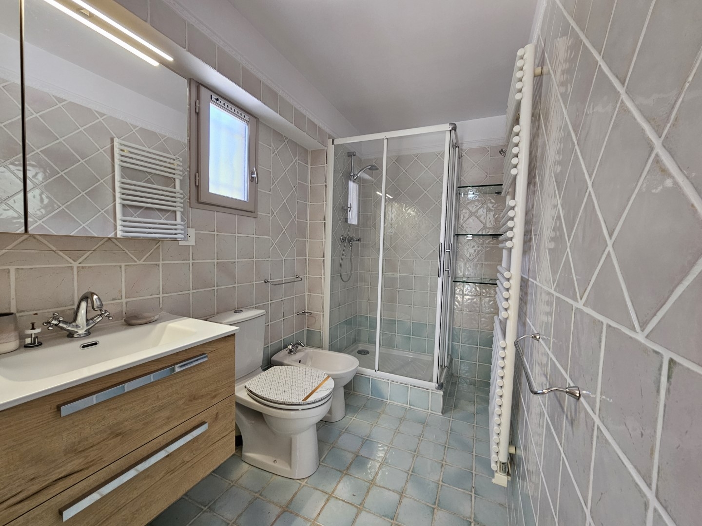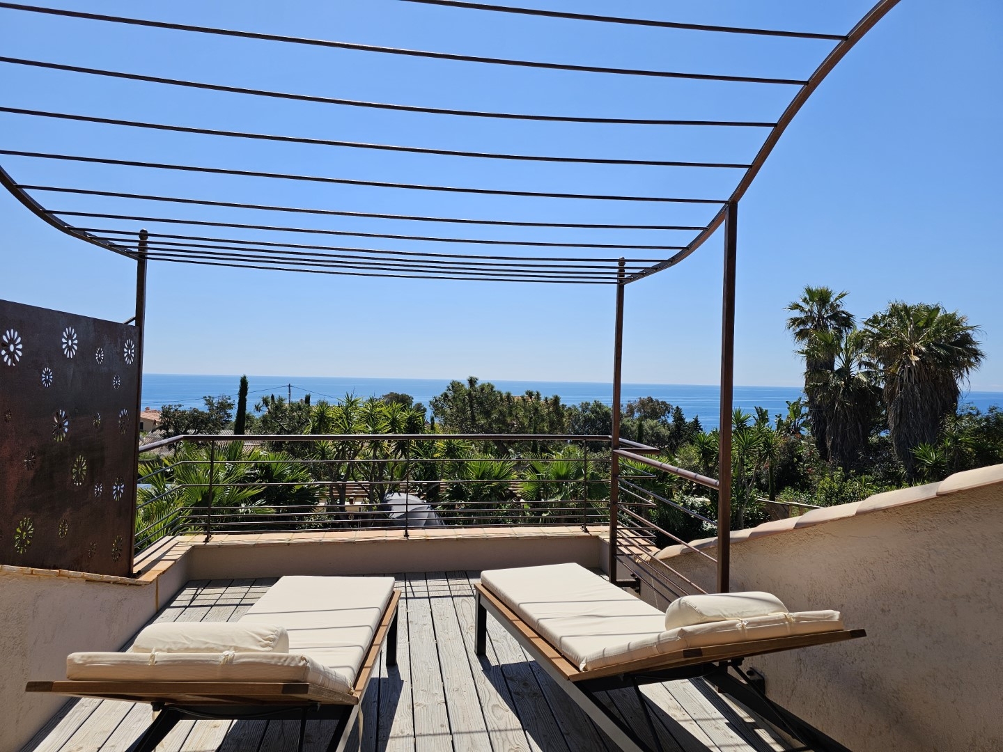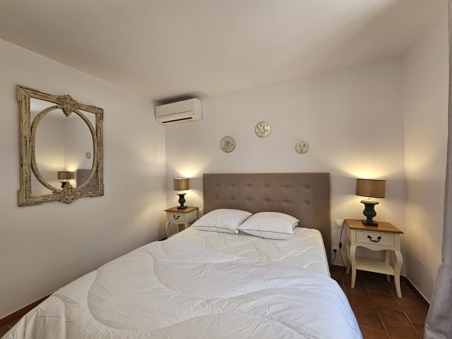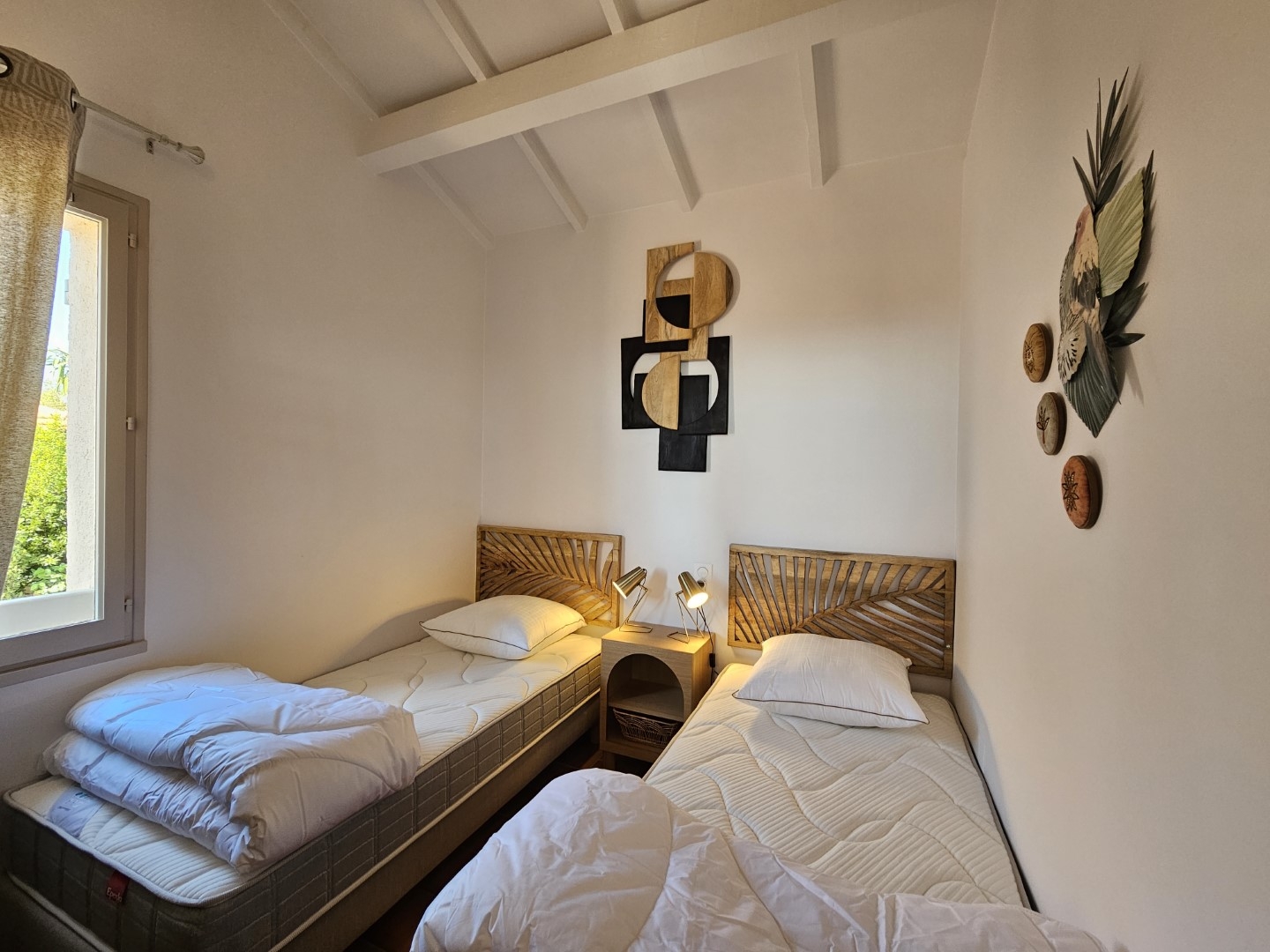 A l’étage, on retrouve une troisième chambre avec deux lits simples, une troisième salle d’eau avec wc, une quatrième chambre avec lit double 160x200, et la chambre de maître avec son grand lit double 180x200, TV, et sa belle terrasse avec une très jolie vue sur la mer. Pour plus de confort la maison est entièrement climatisée.