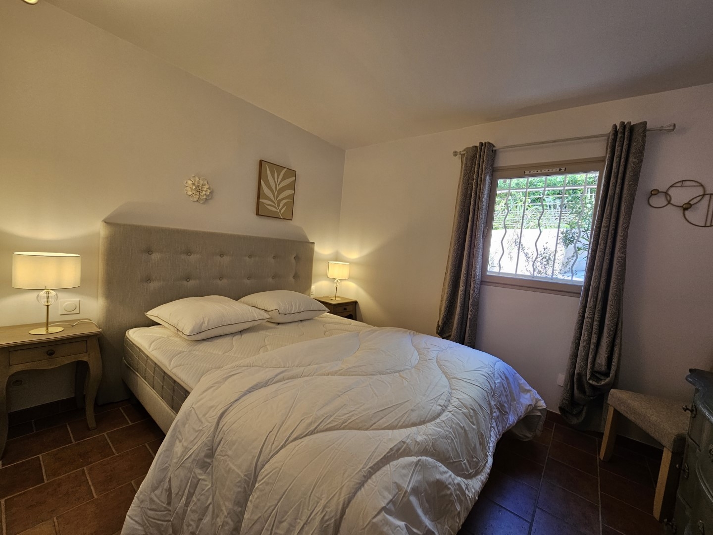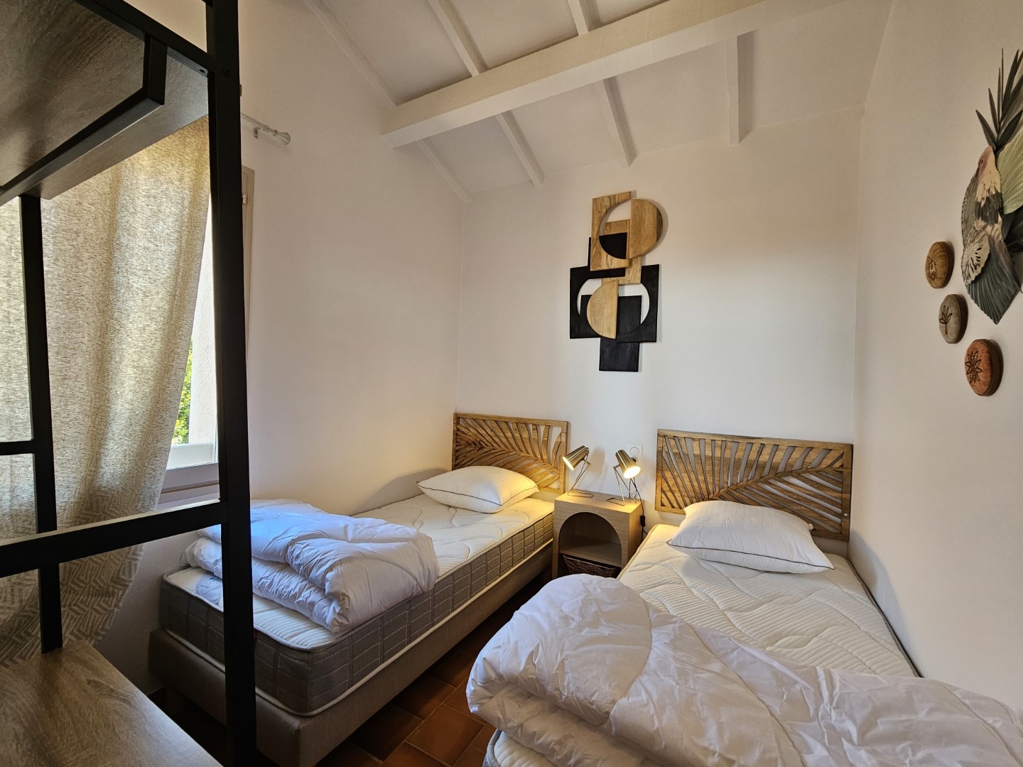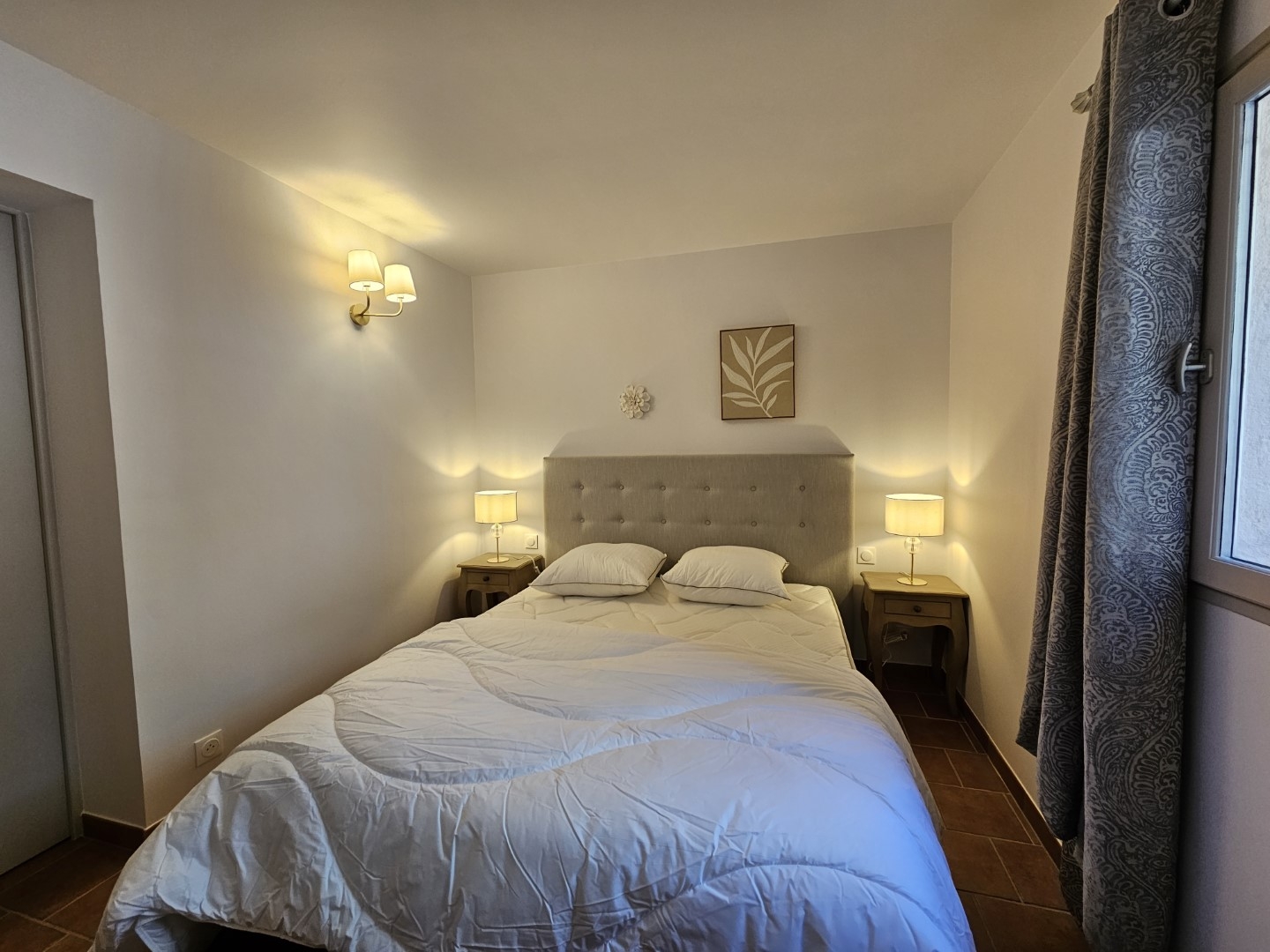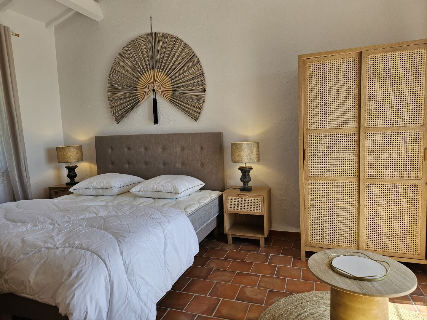 A l’étage, on retrouve une troisième chambre avec deux lits simples, une troisième salle d’eau avec wc, une quatrième chambre avec lit double 160x200, et la chambre de maître avec son grand lit double 180x200, TV, et sa belle terrasse avec une très jolie vue sur la mer. Pour plus de confort la maison est entièrement climatisée.