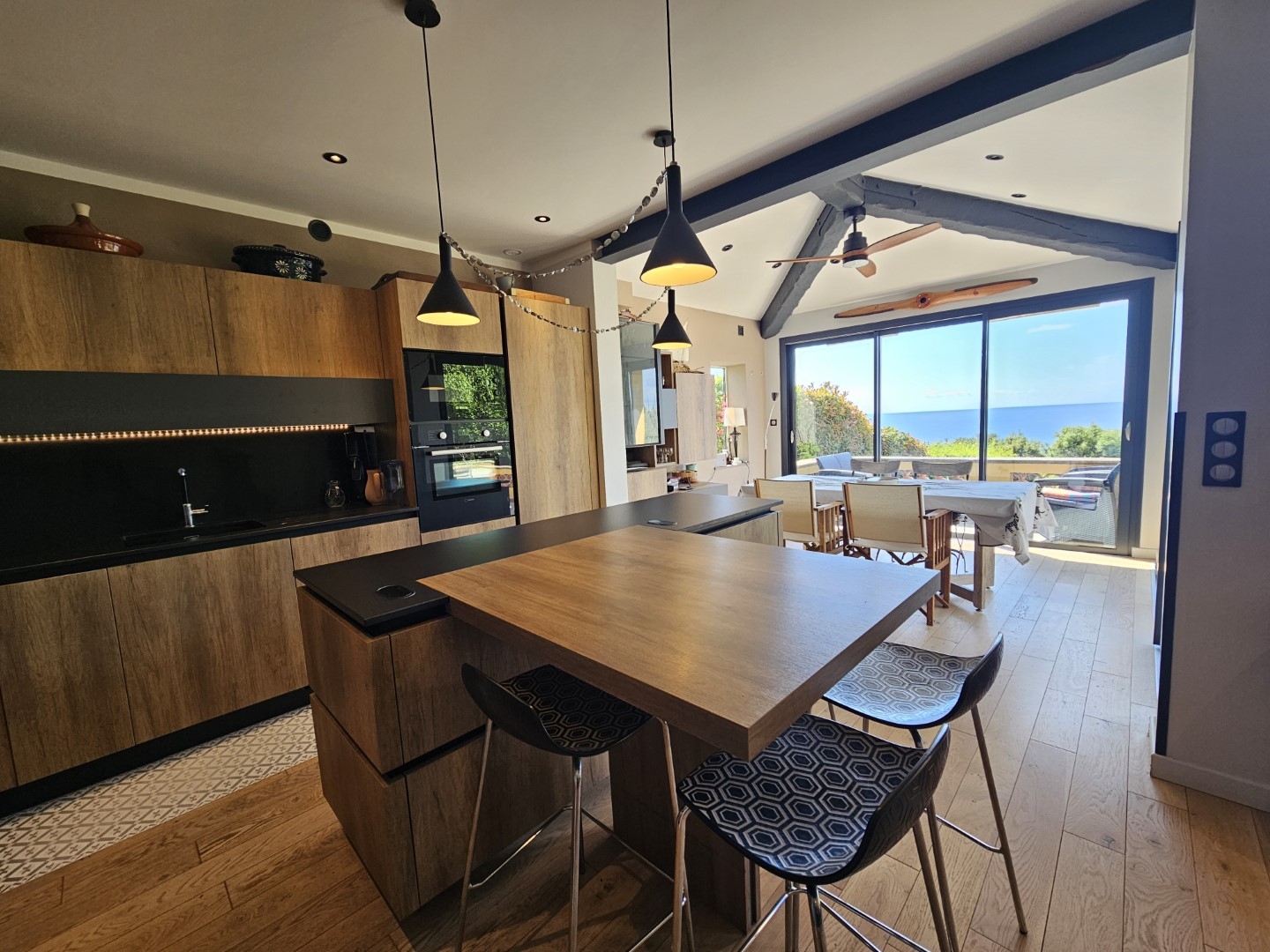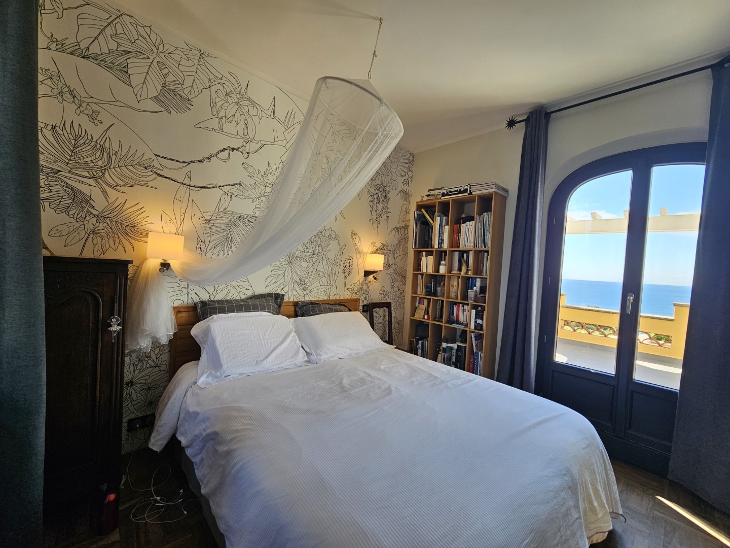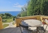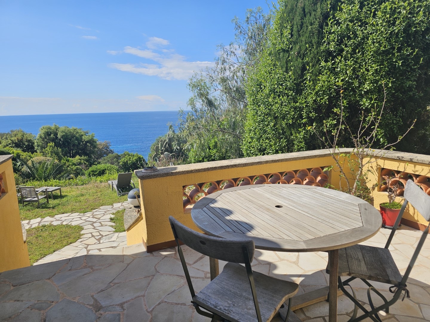 Un superbe panorama sur le jardin de la propriété et sur la mer. Cette villa tournée vers la mer vous ouvre ses portes pour des vacances reposantes. On accède à la villa par sa partie centrale où l’on retrouve l’espace de vie avec un séjour donnant sur la terrasse face à la Grande Bleue, une cuisine tout équipée (frigidaire, congélateur, plaque induction, four, micro-ondes, cafetière, grille-pain, bouilloire, etc.), une pièce avec télévision et un canapé-lit double, une salle de bains (baignoire et lavabo), un wc séparé. Au niveau inférieur, on retrouve une 2e chambre avec 1 lit double en 140x200, une salle d'eau (douche, plan vasque), un wc séparé, et un salon tv avec canapé. A l'étage supérieur, une 3e chambre avec 1 lit double en 160x200, une salle de bains (avec baignoire, plan vasque et wc), un dressing et accès à une grande terrasse surplombant la mer et le jardin.