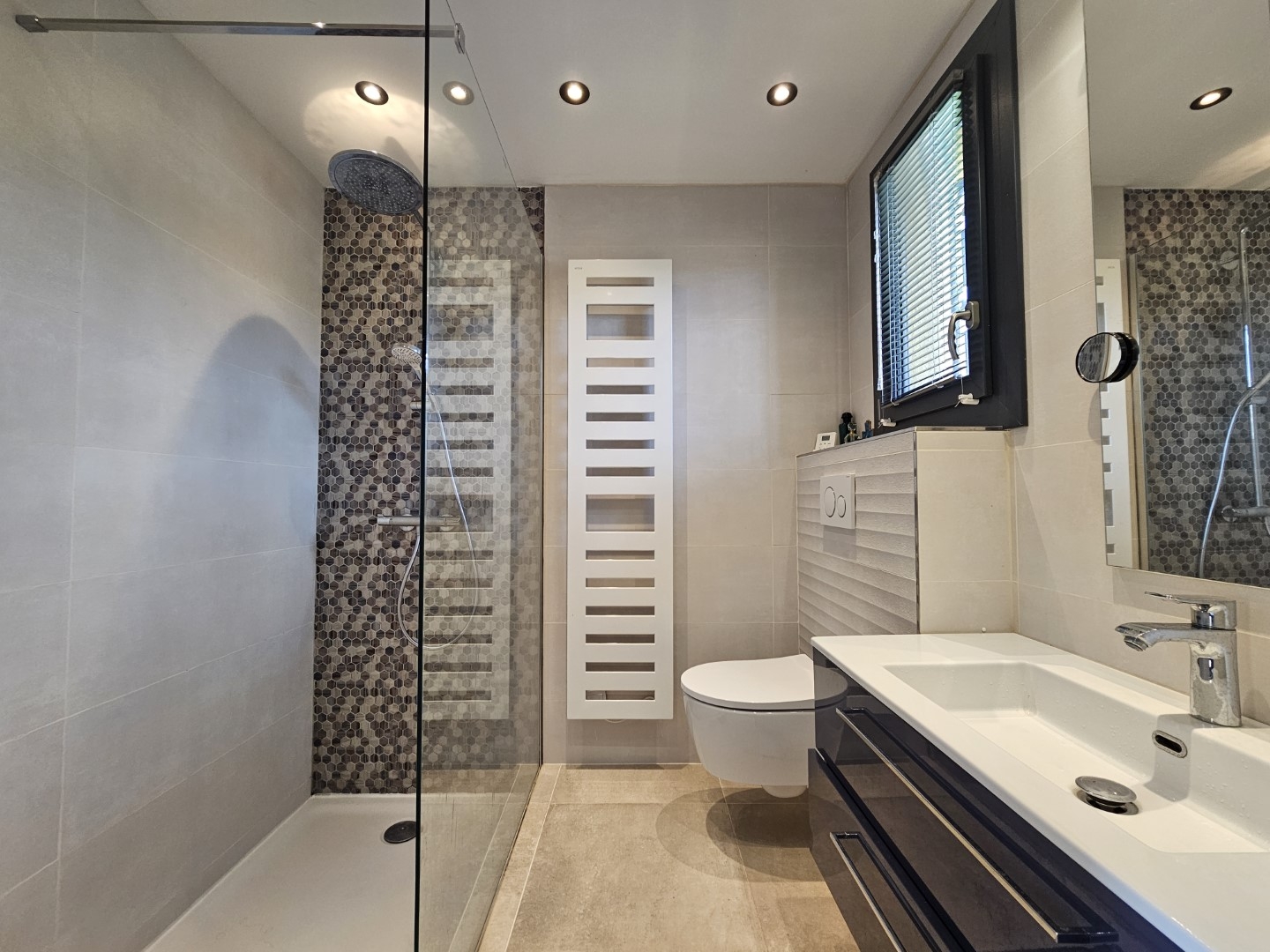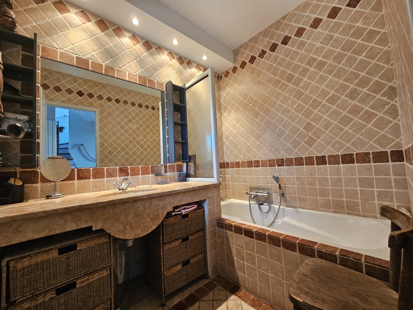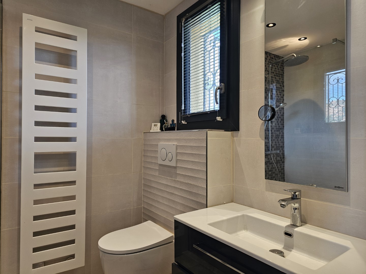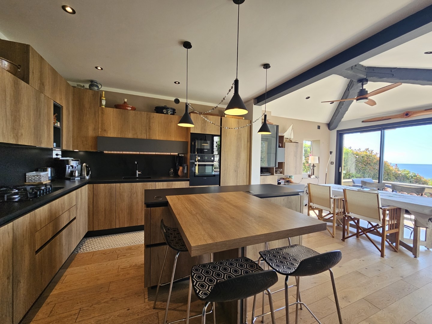 Un superbe panorama sur le jardin de la propriété et sur la mer. Cette villa tournée vers la mer vous ouvre ses portes pour des vacances reposantes. On accède à la villa par sa partie centrale où l’on retrouve l’espace de vie avec un séjour donnant sur la terrasse face à la Grande Bleue, une cuisine tout équipée (frigidaire, congélateur, plaque induction, four, micro-ondes, cafetière, grille-pain, bouilloire, etc.), une pièce avec télévision et un canapé-lit double, une salle de bains (baignoire et lavabo), un wc séparé. Au niveau inférieur, on retrouve une 2e chambre avec 1 lit double en 140x200, une salle d'eau (douche, plan vasque), un wc séparé, et un salon tv avec canapé. A l'étage supérieur, une 3e chambre avec 1 lit double en 160x200, une salle de bains (avec baignoire, plan vasque et wc), un dressing et accès à une grande terrasse surplombant la mer et le jardin.
