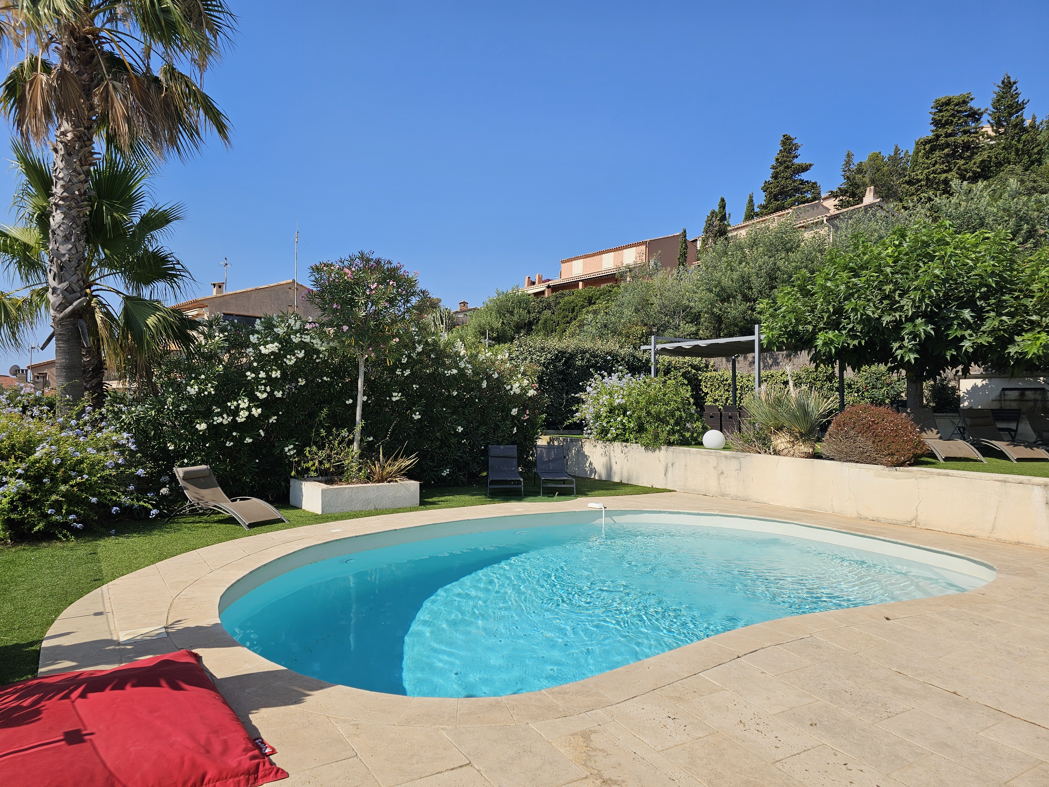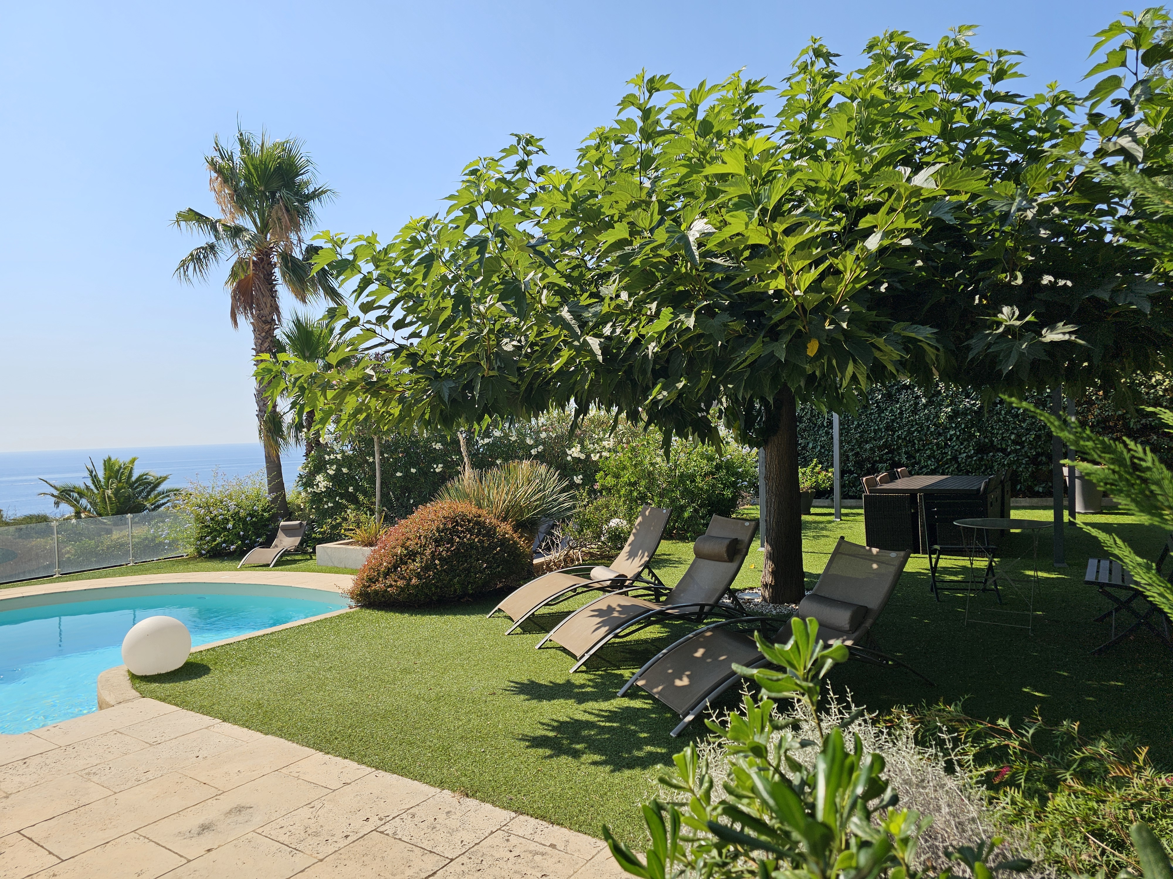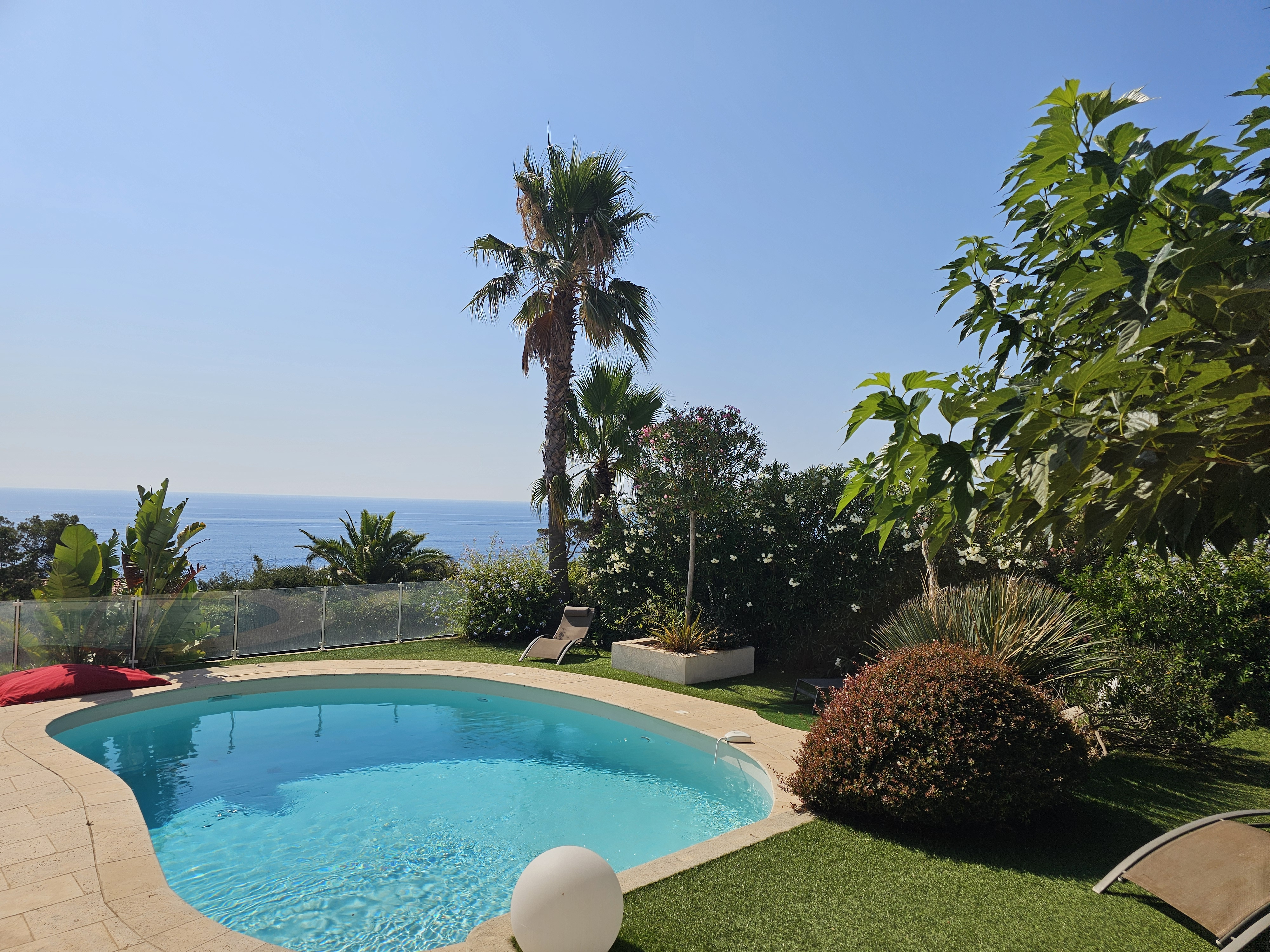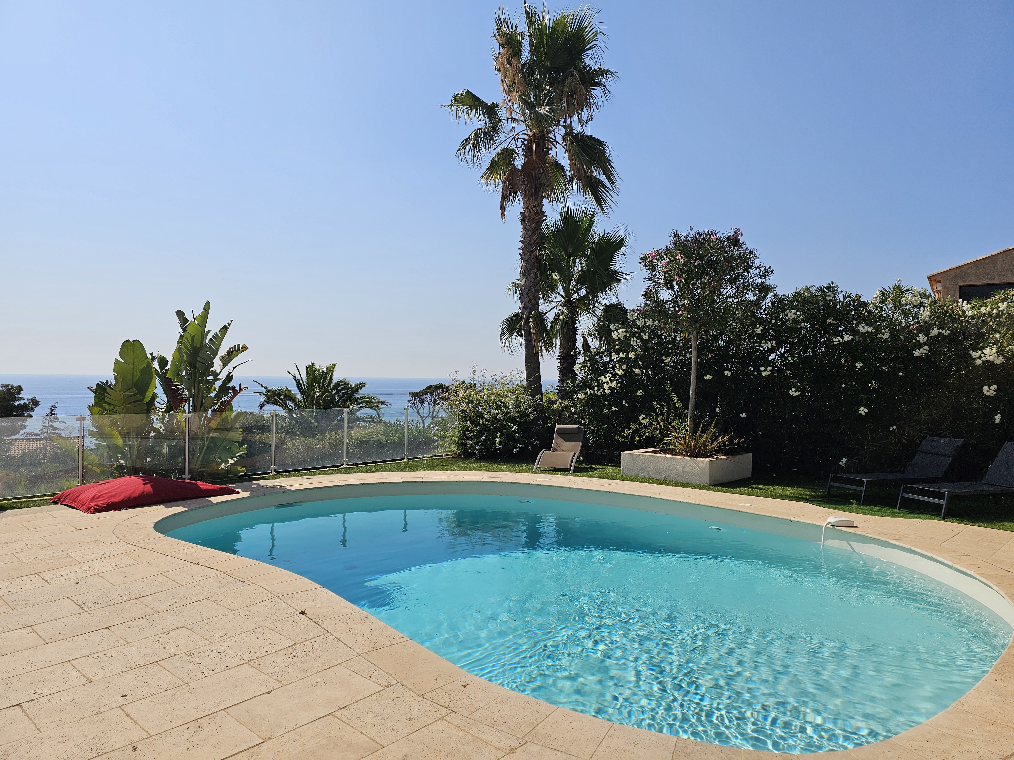 A l'extérieur vous apprécierez le bel espace piscine avec ses bains de soleil, et toujours la vue sur la mer. Sur la terrasse, couverte par une pergola, vous profiterez de bons moments pour vous retrouver autour de la table et du barbecue, près de la fontaine. Vous disposerez également d'un grand garage double, et de stationnements possibles en contre bas de la maison, et d'un terrain de pétanque à l'arrière de la maison.