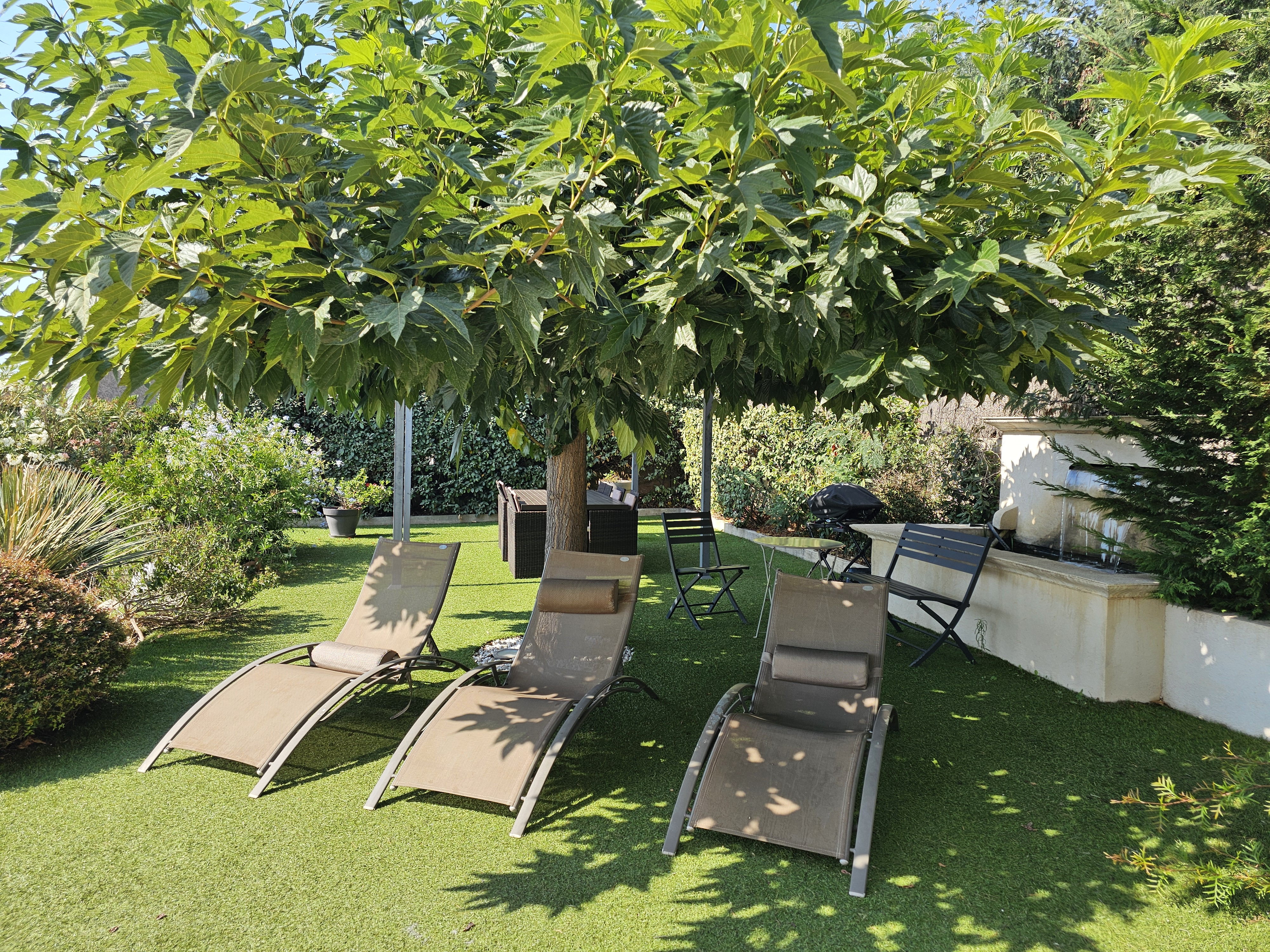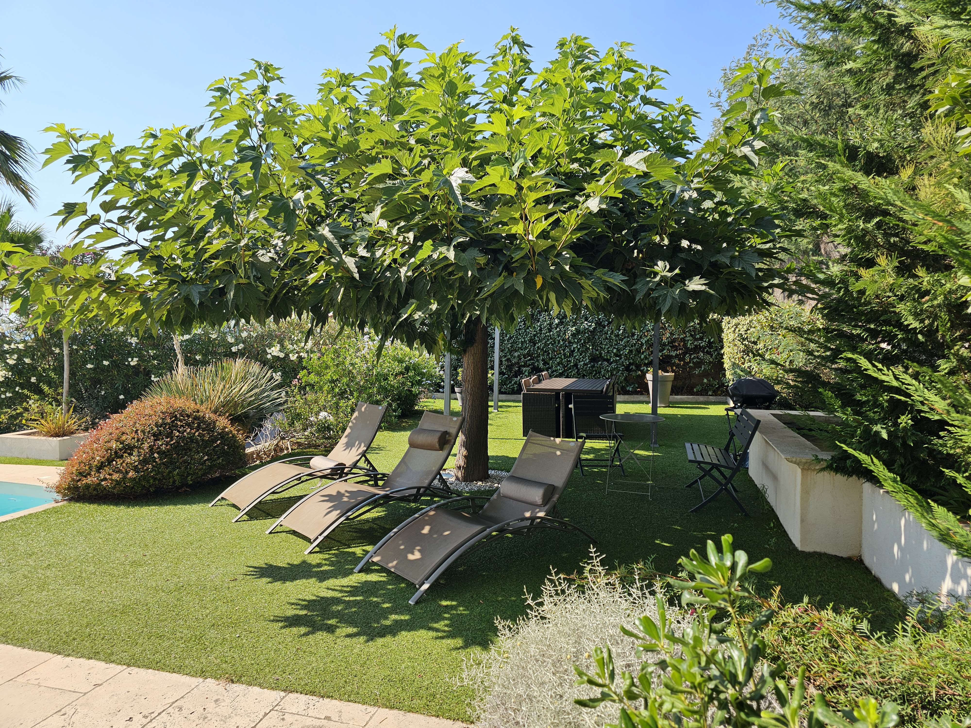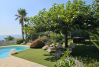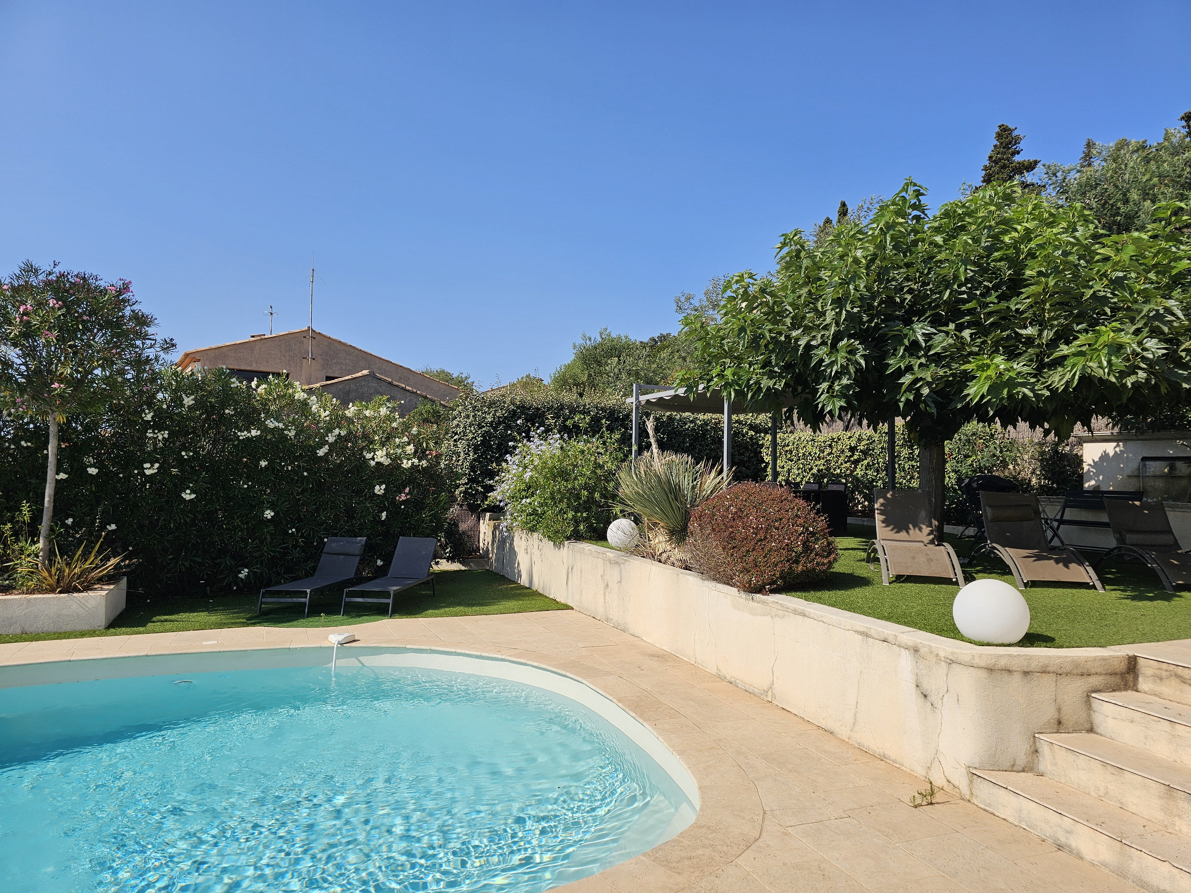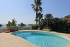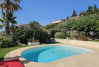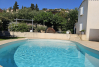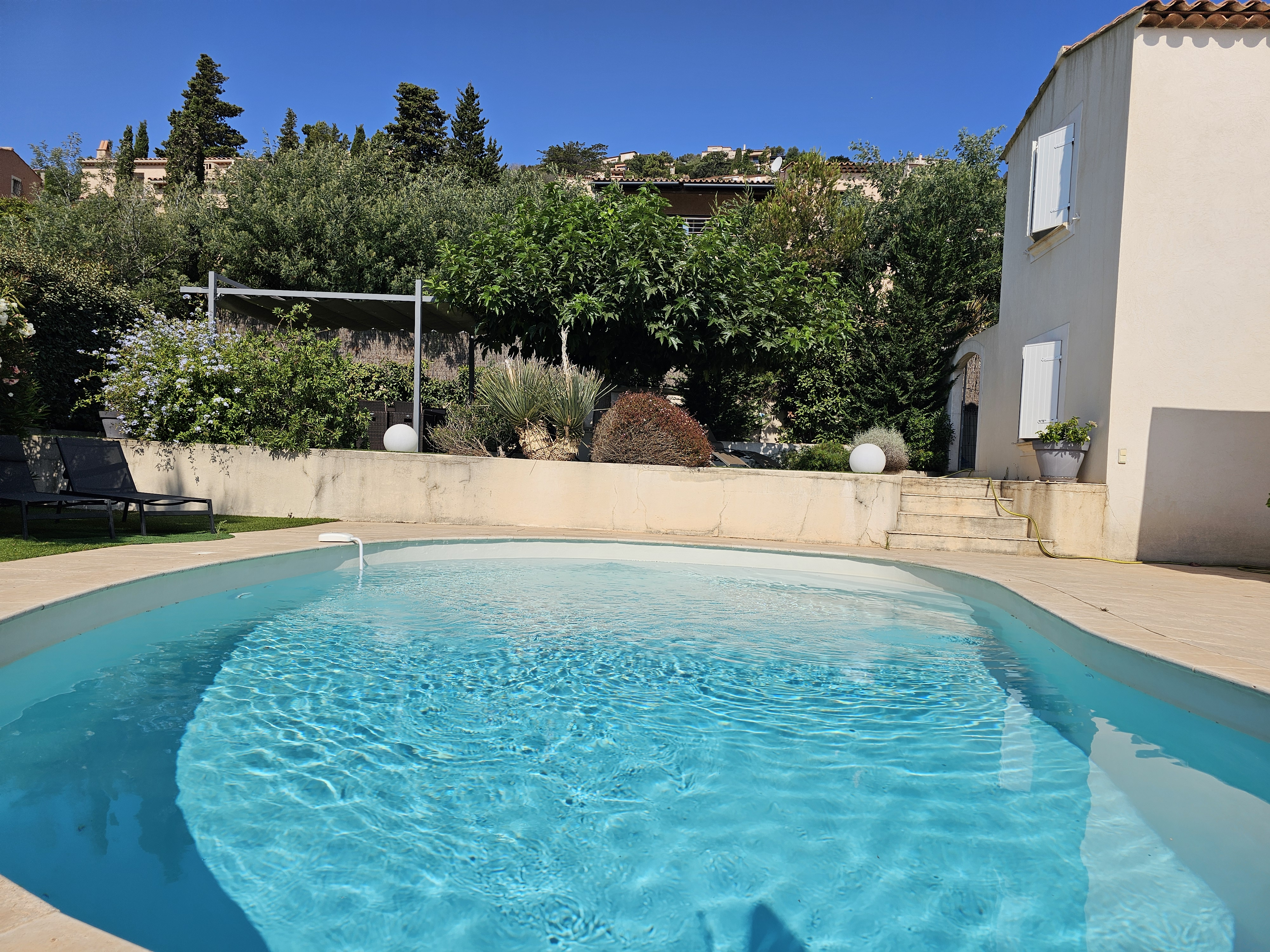 A l'extérieur vous apprécierez le bel espace piscine avec ses bains de soleil, et toujours la vue sur la mer. Sur la terrasse, couverte par une pergola, vous profiterez de bons moments pour vous retrouver autour de la table et du barbecue, près de la fontaine. Vous disposerez également d'un grand garage double, et de stationnements possibles en contre bas de la maison, et d'un terrain de pétanque à l'arrière de la maison.