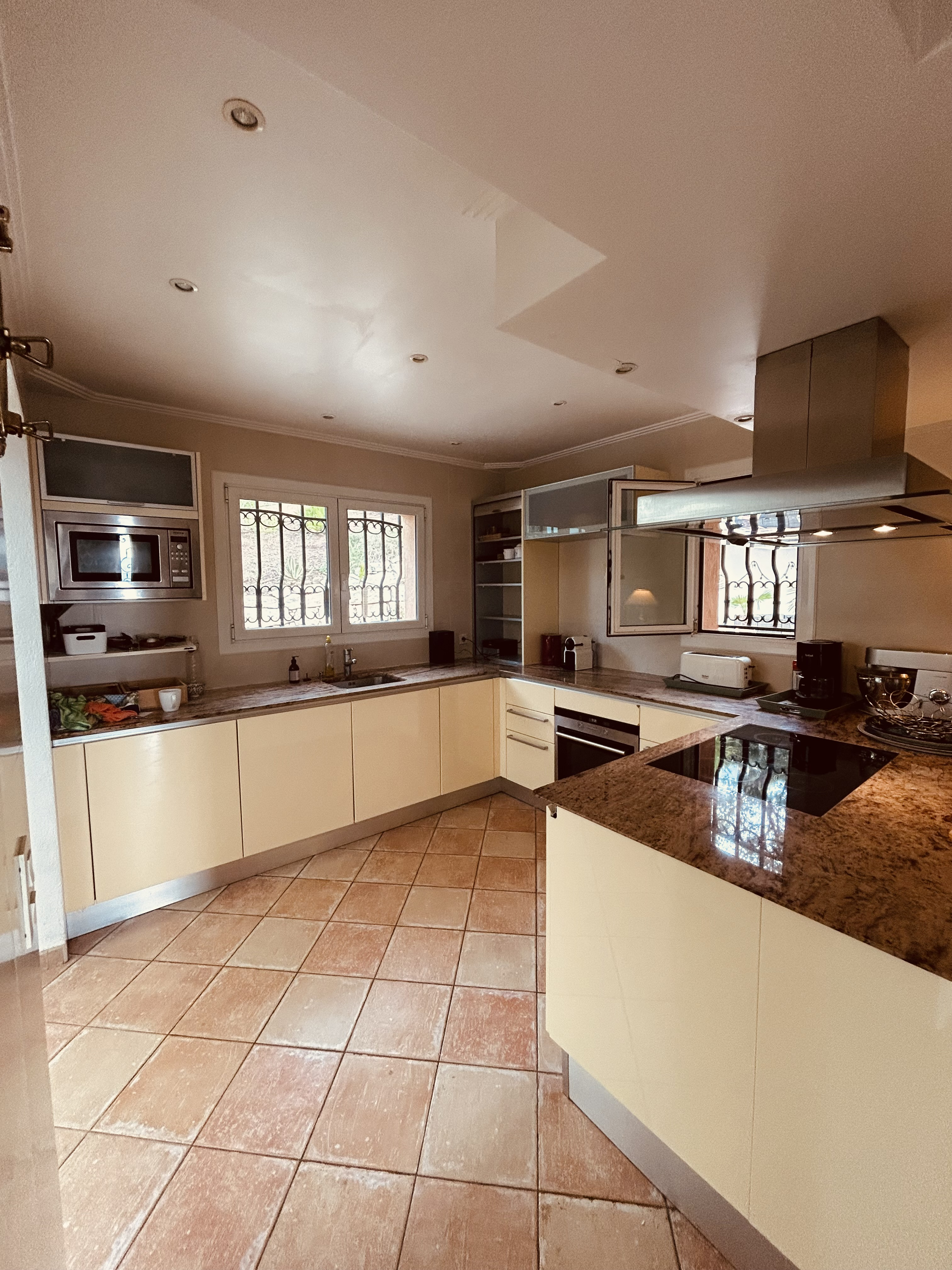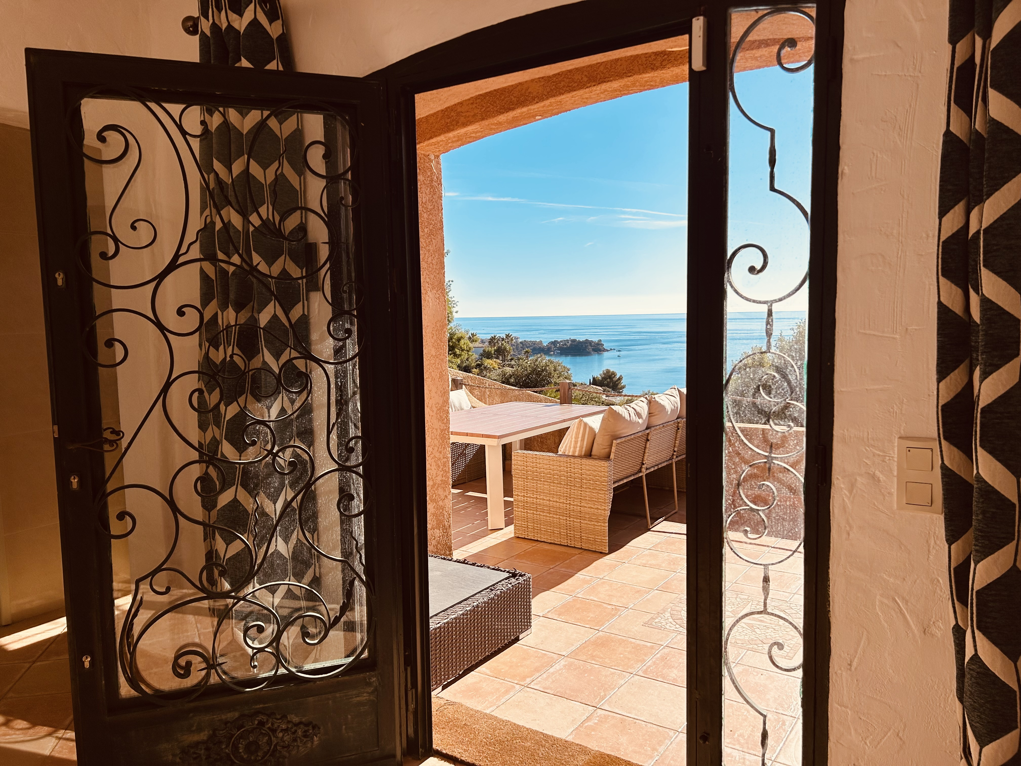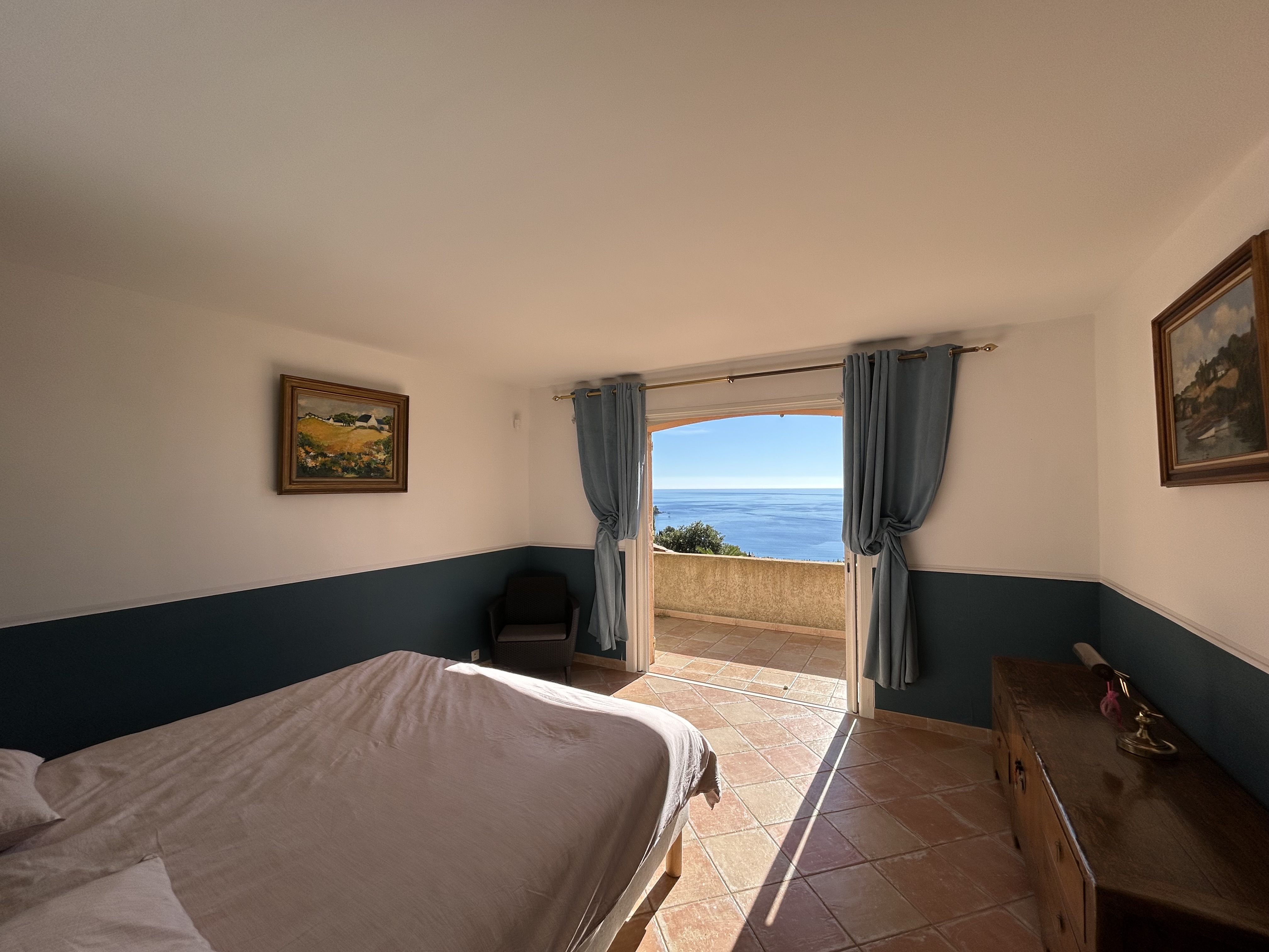 Au rez de chaussée, vous apprécierez vous reposer dans le grand canapé d'angle du salon ; vous pourrez prendre vos repas dans la grande salle à manger, très lumineuse et accueillante grâce à son plafond de belle hauteur et sa grande ouverture face au massif de l’Estérel. A moins que vous ne préfériez profiter de la terrasse côté mer avec sa vue sur la baie. Que vous soyez adeptes ou non de grande cuisine en vacances, vous profiterez de tous les équipements et de l’espace offert par la cuisine toute équipée (four, micro-ondes, frigo US, cave à vin, lave-vaisselle, cafetière, grille-pain, etc..), avec de nouveau un bel espace repas attenant et ouvert sur l’Estérel. Enfin, vous pourrez vous reposer dans la chambre de maître, d’où la vue est magique sur la baie d’Agay, et la presqu’ile du Dramont. Cette chambre dispose d’un grand lit double 180x200 avec salle d’eau privative et wc. Toujours au même niveau, devant le salon, une grande terrasse face à la mer vient compléter, avec salon de détente, vous permettra de profiter de la vue à tout moment de la journée.
