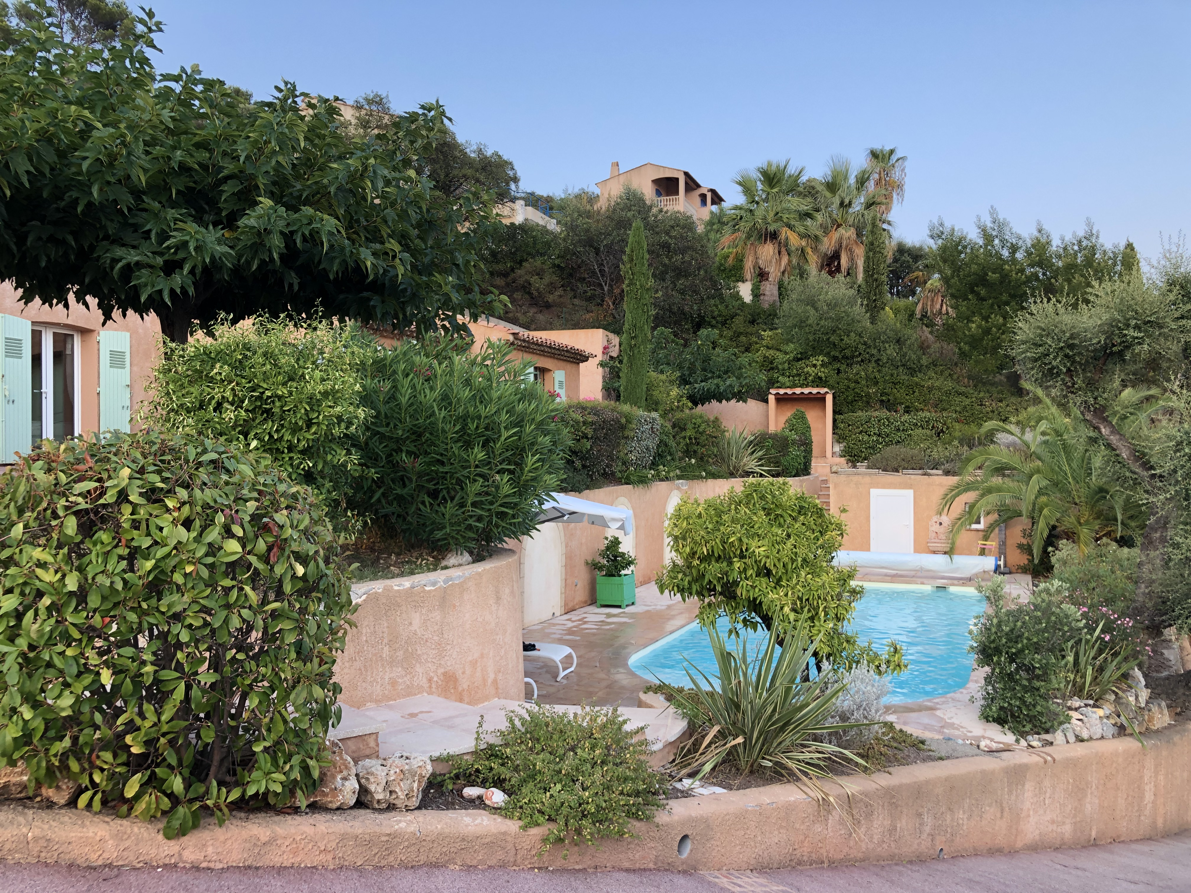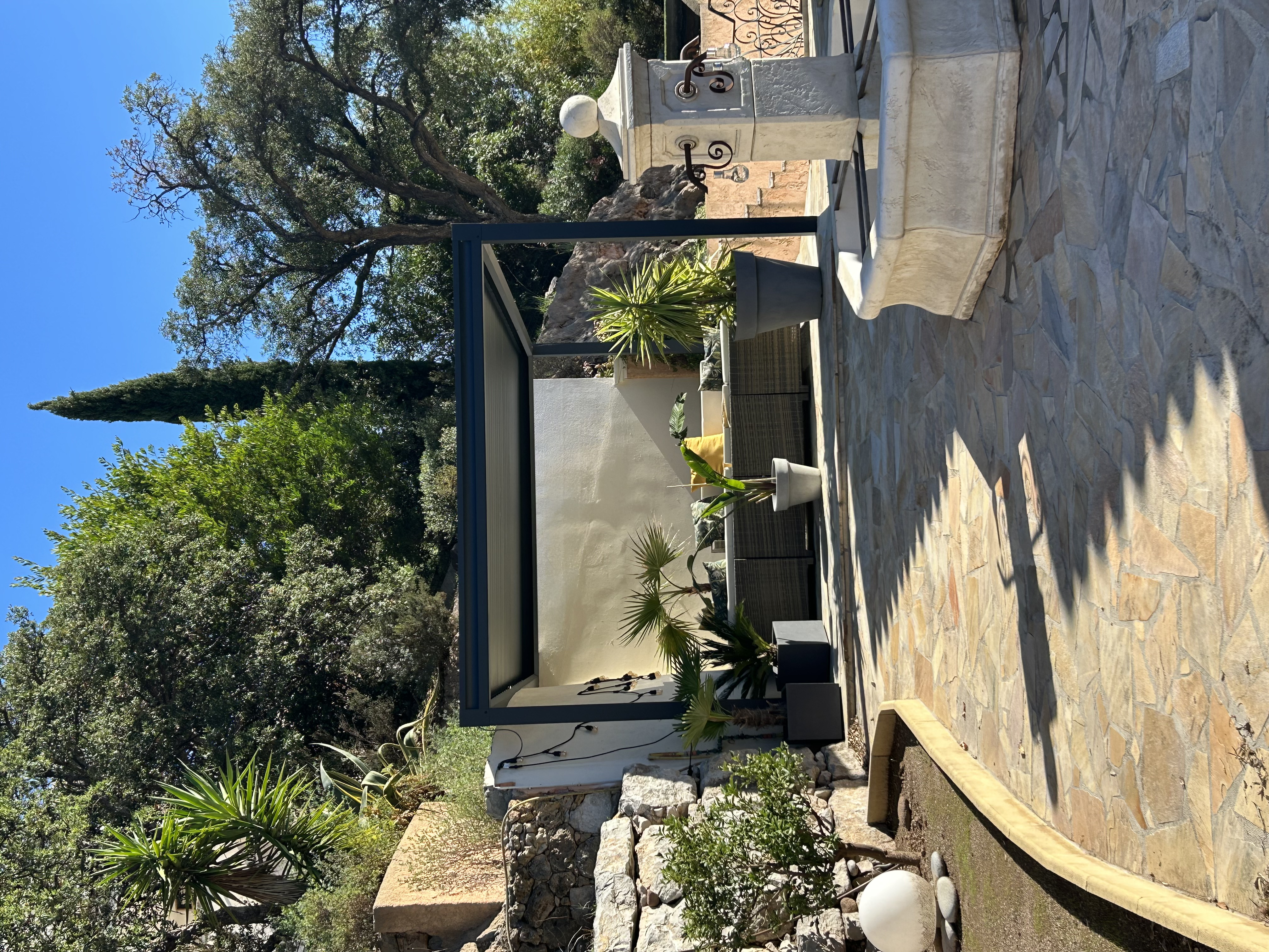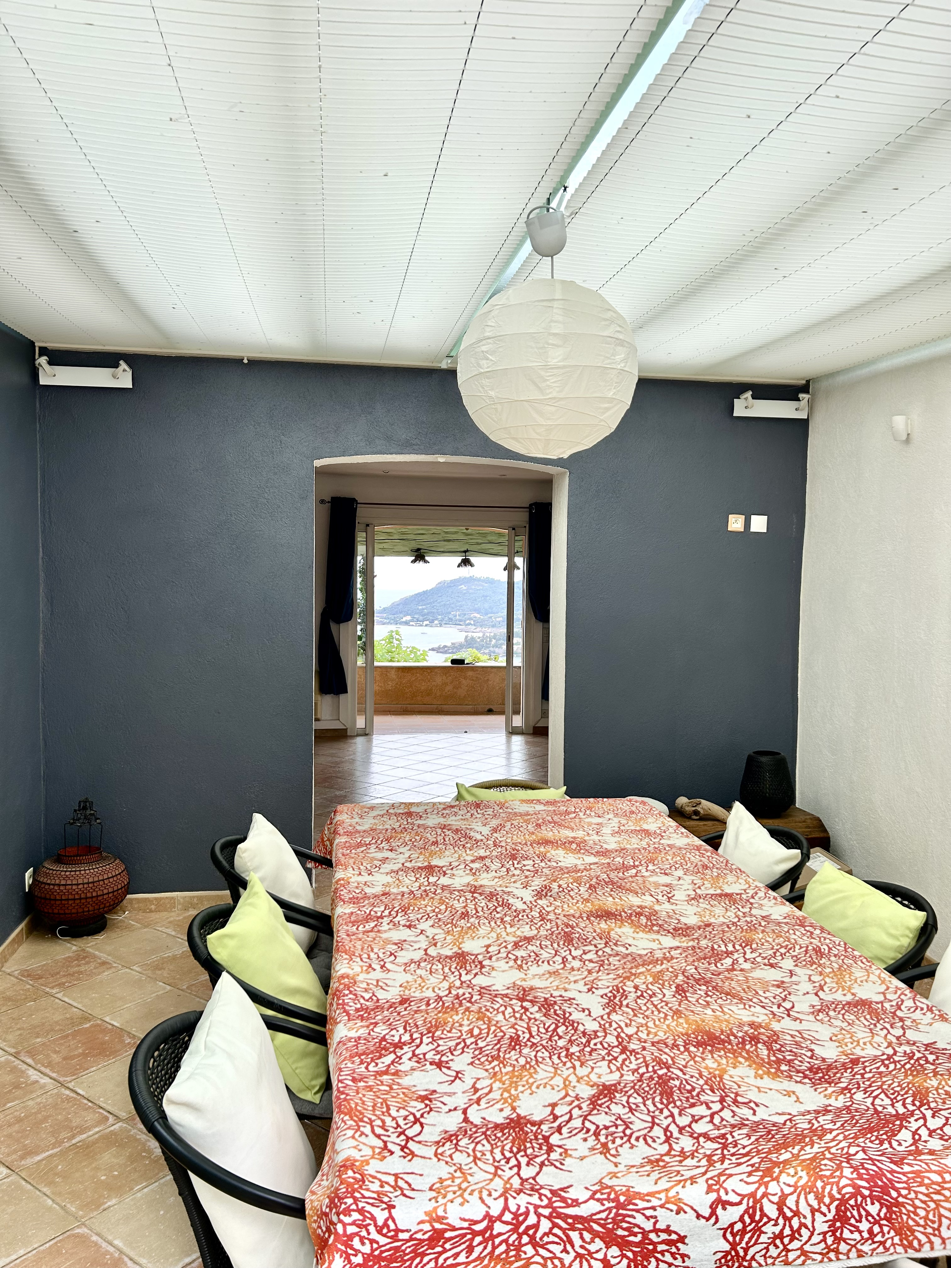 A l’arrière de la villa, côté Estérel, se trouve encore un très grand espace avec terrasse couverte, table et chaises et barbecue.