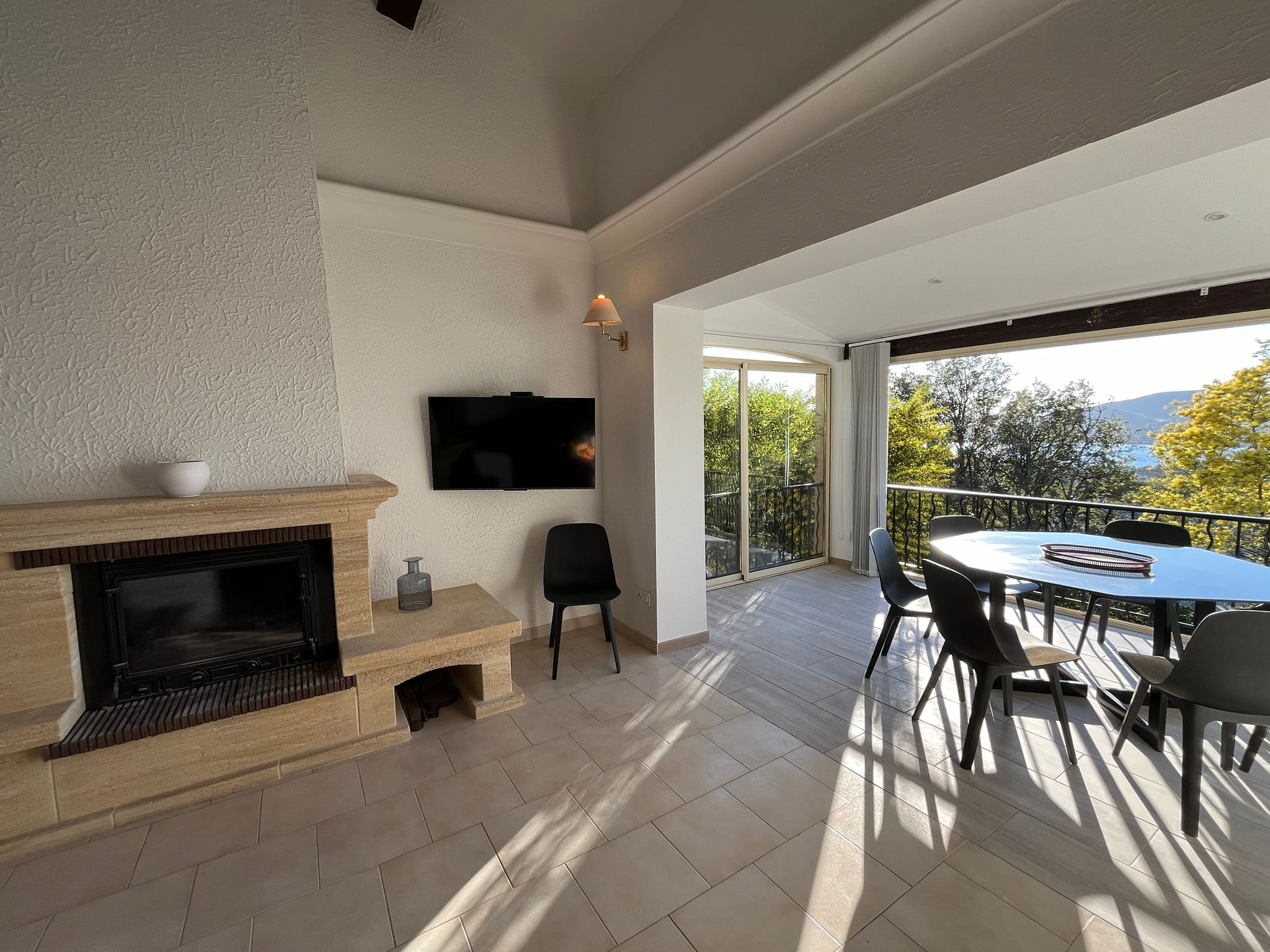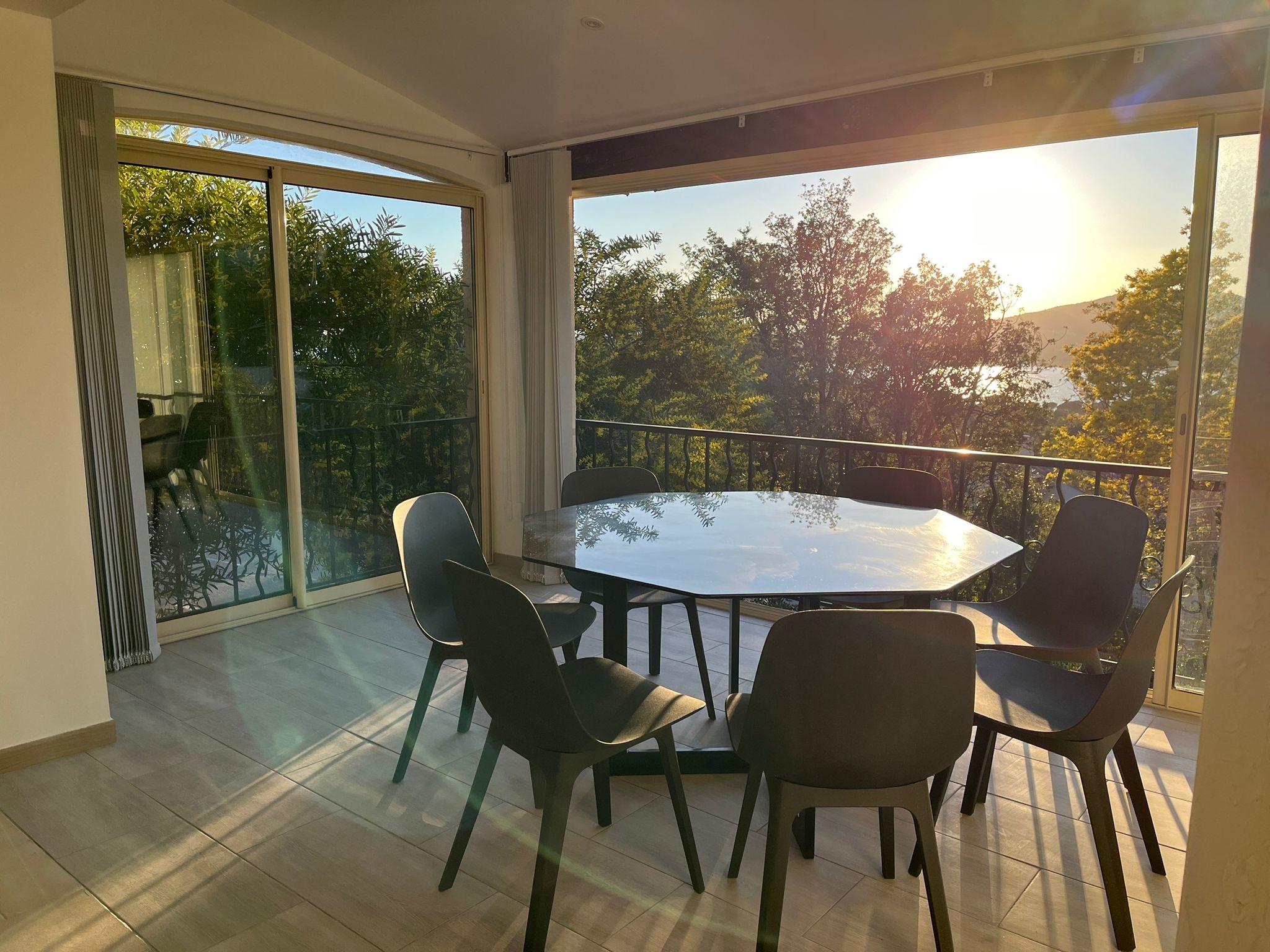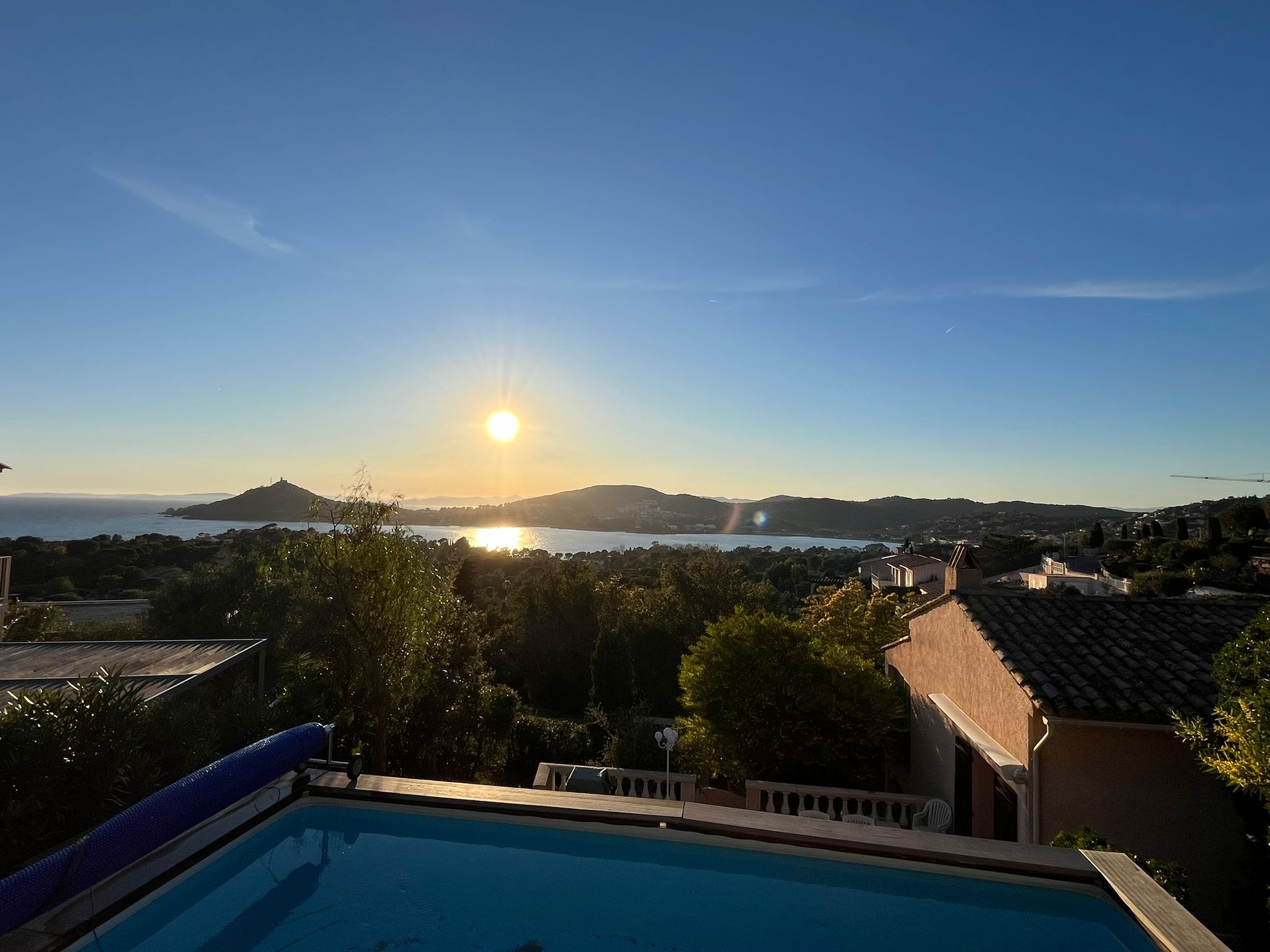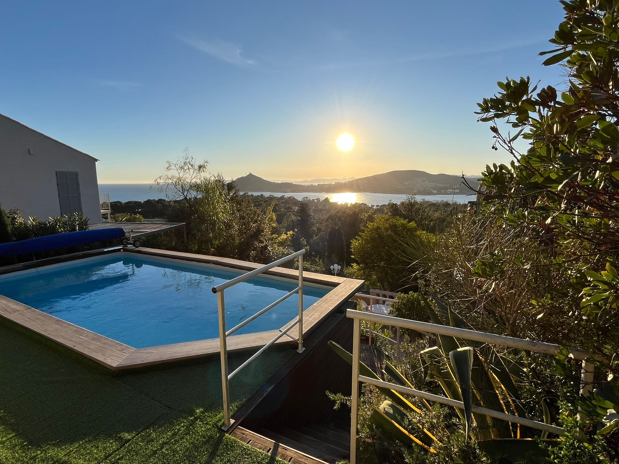 La partie haute de la maison se compose d’un hall d’entrée avec espace buanderie, une cuisine équipée, un grand séjour, une véranda avec espace repas bénéficiant d’une très jolie vue sur la baie d’Agay. Il y a 3 chambres dont deux avec lits doubles, et une avec deux lits simples, une salle de bains, et un wc séparé. La maison est climatisée pour davantage de confort, et devant le séjour vous profiterez d’une très grande terrasse ensoleillée, aménagée avec salon de jardin, table et chaises pour les repas à l’extérieur, plancha, parasol et store pare soleil. Le jardin est entièrement clos, et une belle piscine hors sol vous attend sur la partie haute avec une superbe vue sur la baie.